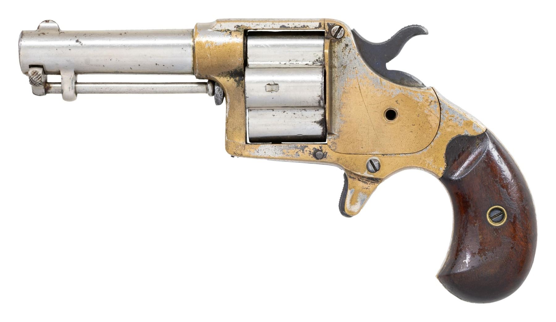 Cal. 41 RF. S# 5423. Bbl. 3" rnd. with Hartford address and semi-circular front sight. 4-shot cloverleaf shaped cyl. Brass frame with spur trigger. Nickel finish with case colored hammer and trigger. 2-piece walnut birds head grips. Frame and bbl. have matching S#s. Total of 9,952 mfg. 1871-1876. CONDITION: bbl. and cyl. retain 70% nickel finish. Brass frame has 40% nickel finish. Head is broken off hammer screw leaving sideplate partially loose. Cyl. pin bushing is not present. Grips have worn finish showing handling marks. Functioning action. Bbl. has sound rifling showing some very minor pitting. (01-26673/DS). ANTIQUE. $1,500-2,000.