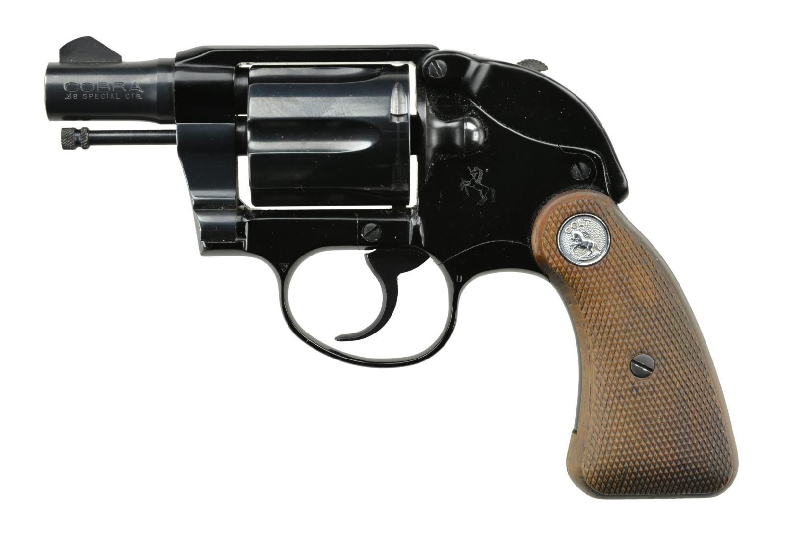 Cal. 38 Spl. S# 265370LW. Bbl. 2" w/ serrated blade. Mfg. 1968 (1950-1972) as first issue (exposed ejector rod) having later shorter gripped alloy frame w/ raised panel checkered walnut grips extending below frame plus silver medallions. Rare Colt black anodized hammer shroud leaving tip of spur available. CONDITION: very slight mark around lower rear shroud screw likely from improper screwdriver use; all other aspects near excellent w/ unfired appearance. Very slight thinning on top of front sight & outer most edges of bbl. at muzzle. (22-2658/NW). CURIO. $1,000-1,500.
