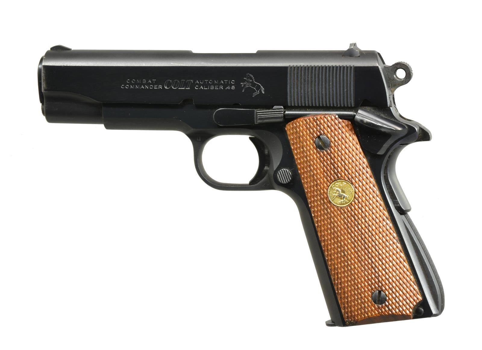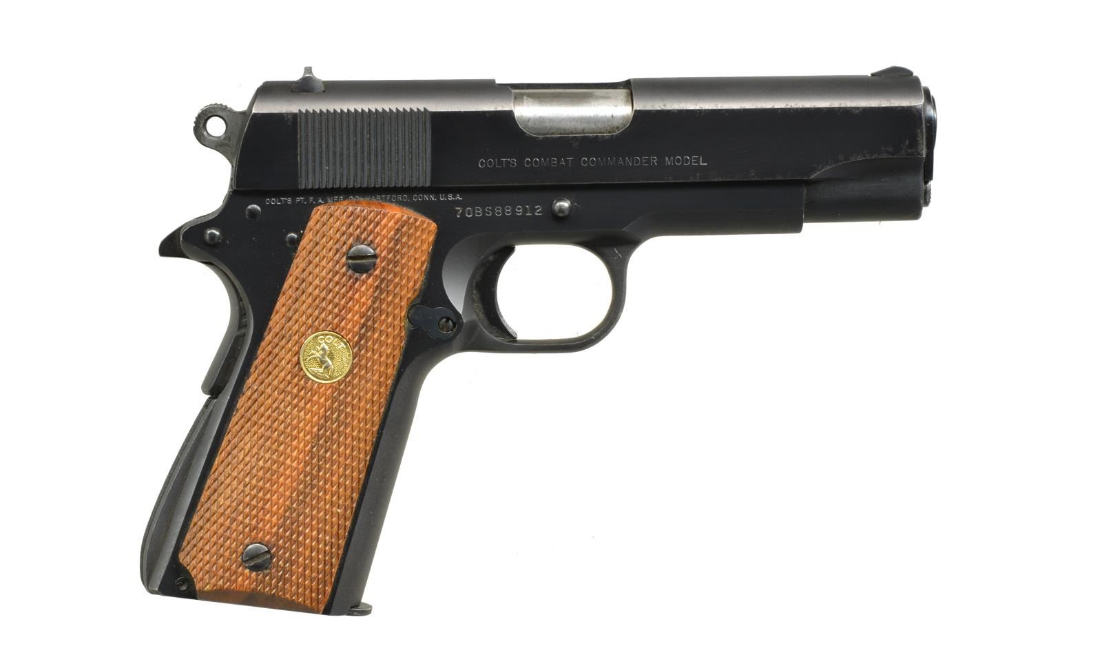 Cal. 45 ACP. S# 70BS88912. Bbl. 4 1/4". Mfg. 1979 (1971-1988) w/ all standard blued Commander features including ring hammer & arched mainspring housing. Checkered walnut grips w/ gold Colt medallions. MAGS: 1 Colt marked 7 rd. CONDITION: good to very good overall appearance w/ slight function wear & thinning at left front of slide. Occasional light peppery oxidation on left side; mostly near front. More light to moderate peppery oxidation on right side of slide near edges. Very good grips; near excellent bore. (20-2133/NW). MODERN. $600-800.