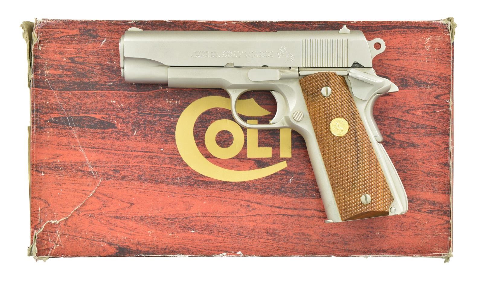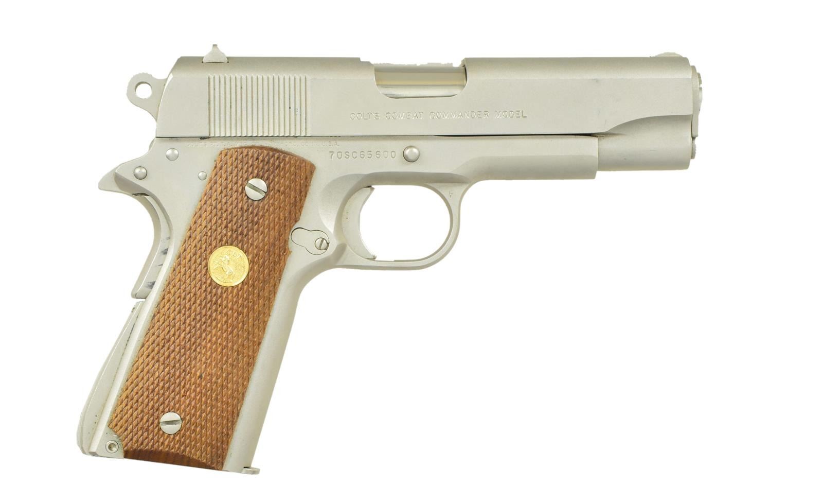 Cal. 45 ACP. S# 70SC65600. Bbl. 4 1/4". Scarce satin nickel finished variation with fixed serrated ramp front sight and fixed notch rear. Commander hammer with factory full checkered wooden grips and gold Colt medallion. MAGS: 1-6 rd. factory. UNATTACHED ACCESSORIES: Woodgrain cardboard factory box with foam insert serial numbered to the pistol. Box is torn and creased in fair condition. CONDTION: metal shows a few scattered light scratches and marks consistent with use. Grips still retain sharp checkering. Bore is near excellent, bright and strong. (22-3067/CW). MODERN. $700-1,100.