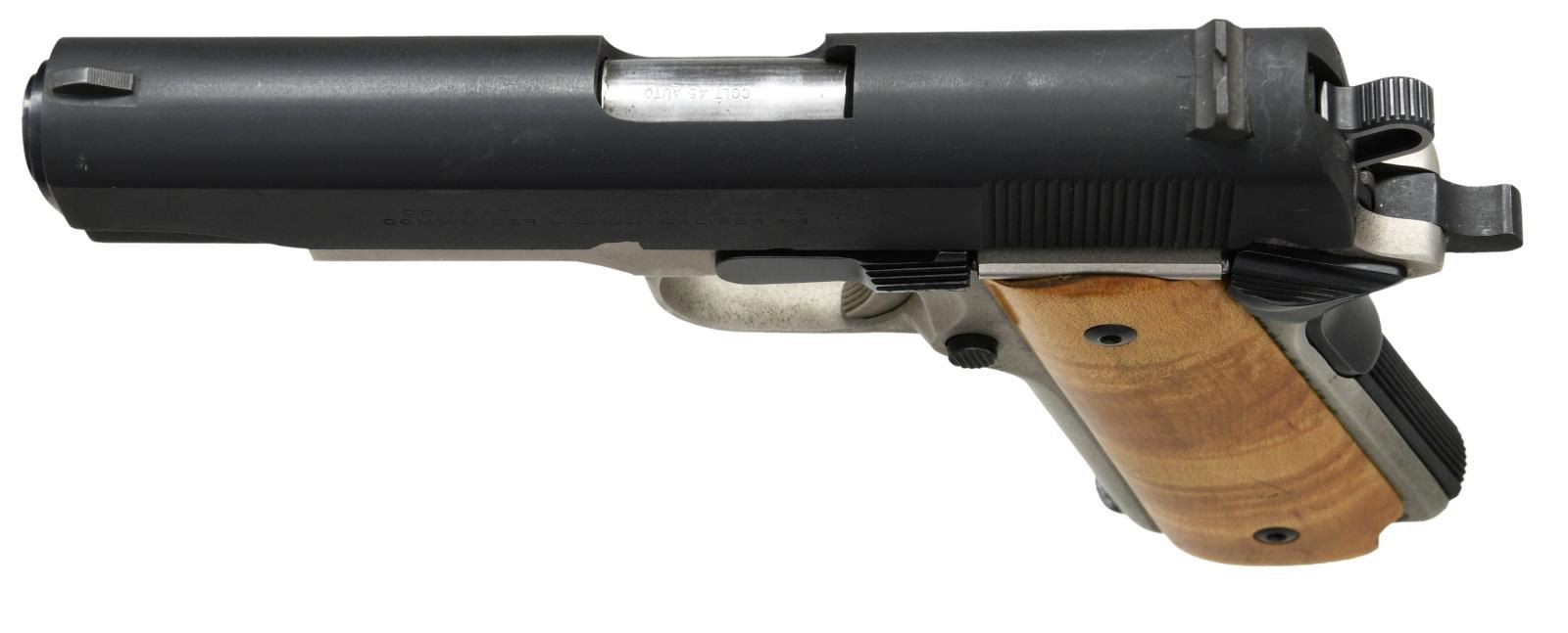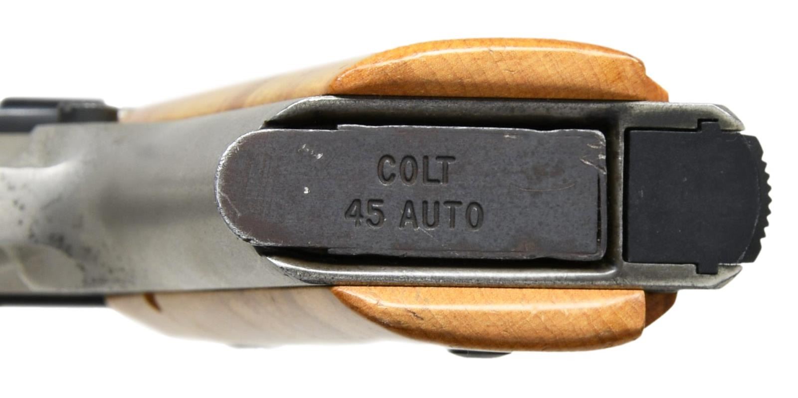 Cal. 45 ACP. S# 70SC-29891. Bbl. 4 1/4". Matte black finished slide w/ fixed sights. Stainless steel frame. Two-piece custom smooth maple grips. MAGS: 1 detachable 7 rd. UNATTACHED ACCESSORIES: in a later production blue-molded box w/ a Series 80 instruction manual. CONDITION: slide retains over 95% of its blue, showing small marks. Frame has a worn finish w/ spotted dark corrosion. Grips show moderate wear & handling marks. Very good, bright bore. (23-6926/DS). CURIO. $900-1,200.