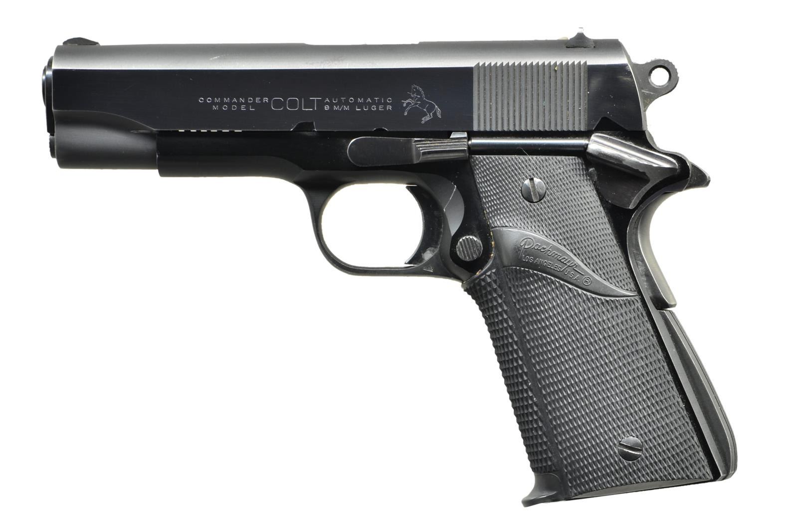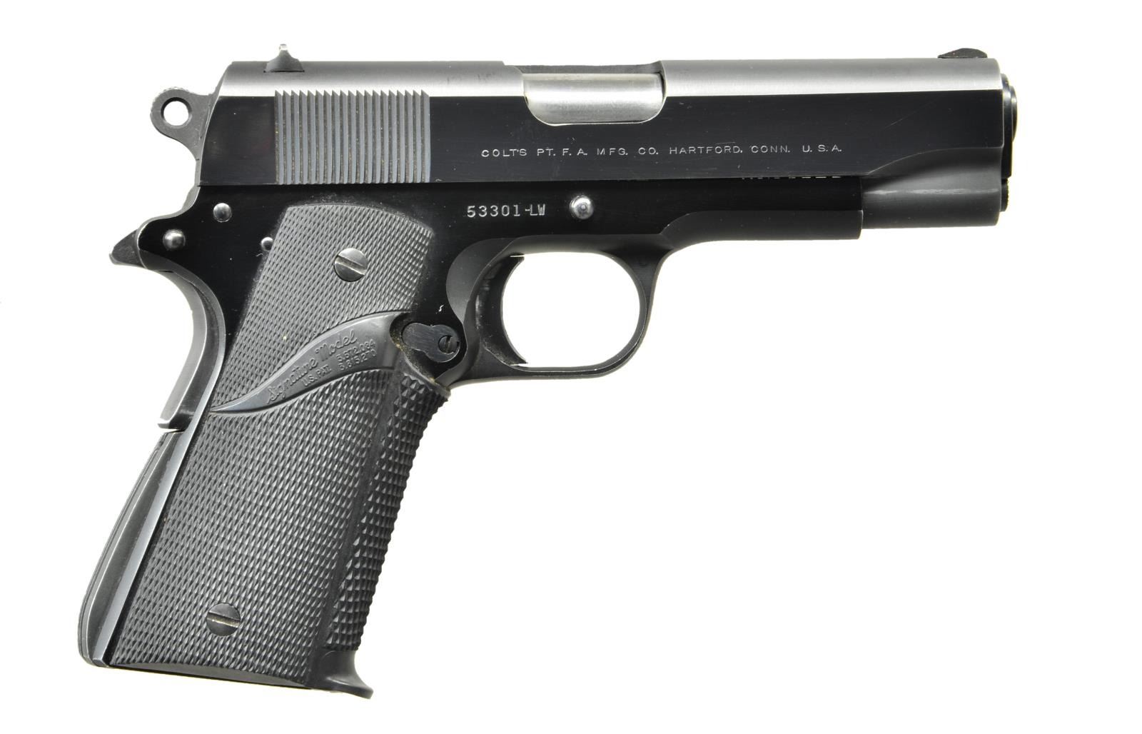 Cal. 9mm Luger. S #53301-LW. Bbl. 4". Mfg. 1967. Serrated ramp front sight w/ added orange paint. Square notch rear sight w/ added orange paint. Rounded hammer. Steel slide. Alloy frame. Pachmayr Signature model grips. MAGS: none present. CONDITION: grips show light handling wear. Metal retains 95% original blue & anodized finishes w/ a disassembly mark on right side of frame & high edge wear. Very good bore that may clean up better. (22-3065/MJC). CURIO. $500-900.