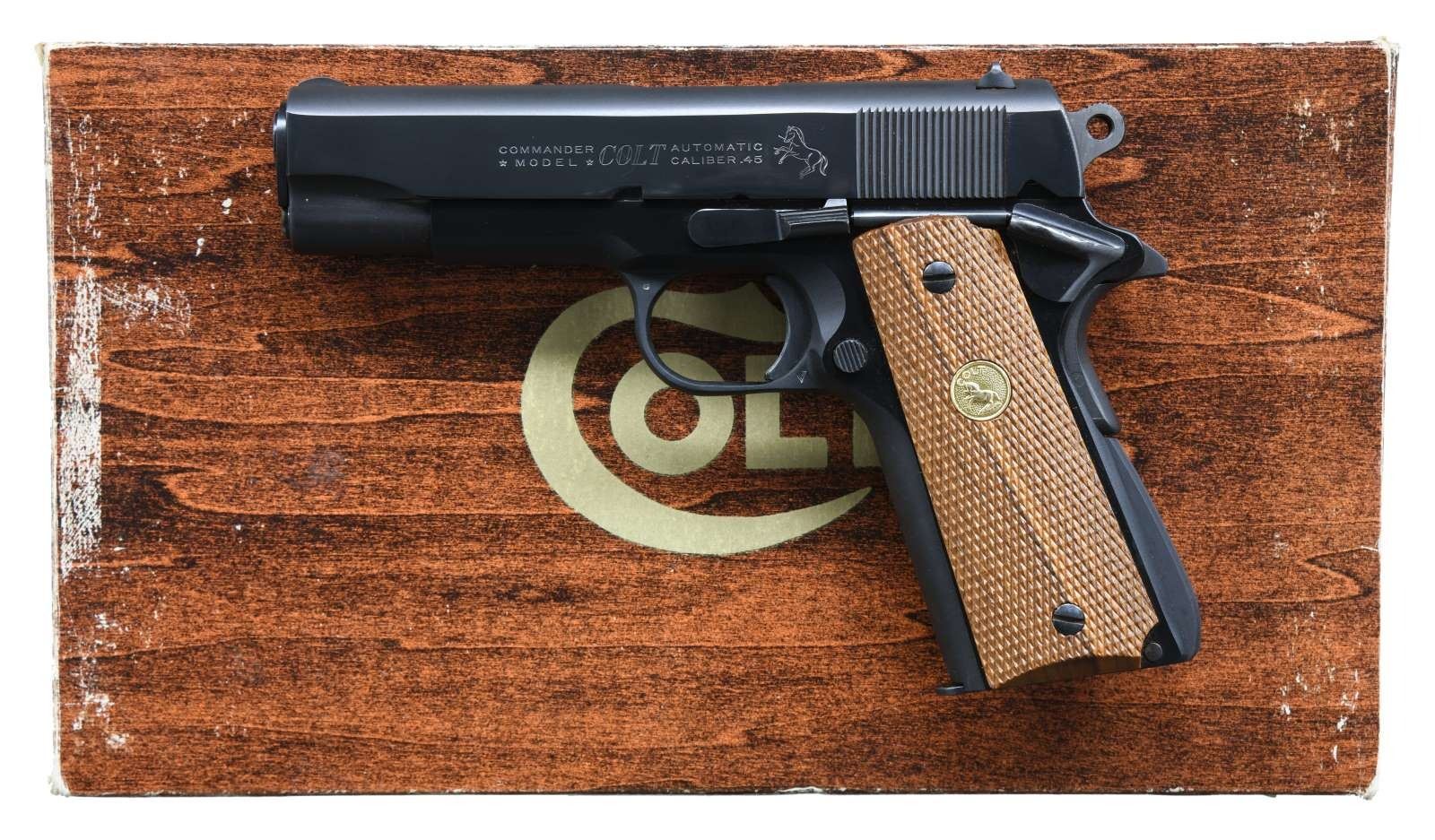 Cal. 45 ACP. S# CLW033919. Bbl. 4 1/4". Mfg. 1978. Square notch rear sight. Rounded blade front sight. Blue finish. Operation is sluggish likely from internal grease build up. Checkered grips w/ gold Rampant Colt medallions. MAGS: 1-7 rd. marked "COLT/.45 AUTO". UNATTACHED ACCESSORIES: factory box matching numbered to gun w/ styrofoam inserts & paperwork. CONDITION: all aspects near excellent w/ some minor handling wear & residue in bore. (23-2429/MJC). MODERN. $700-1100.