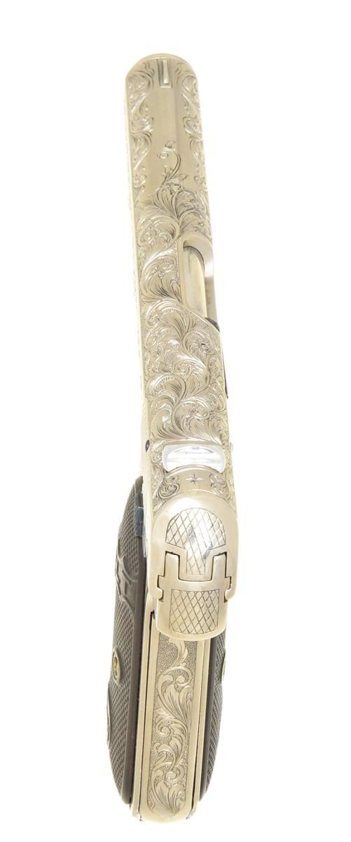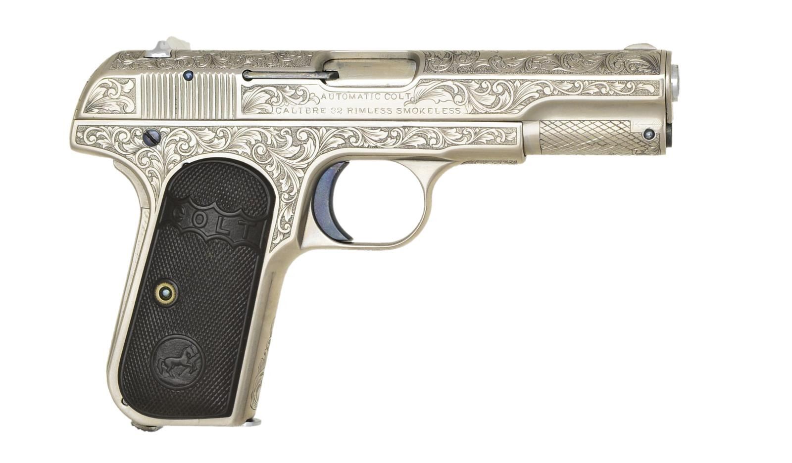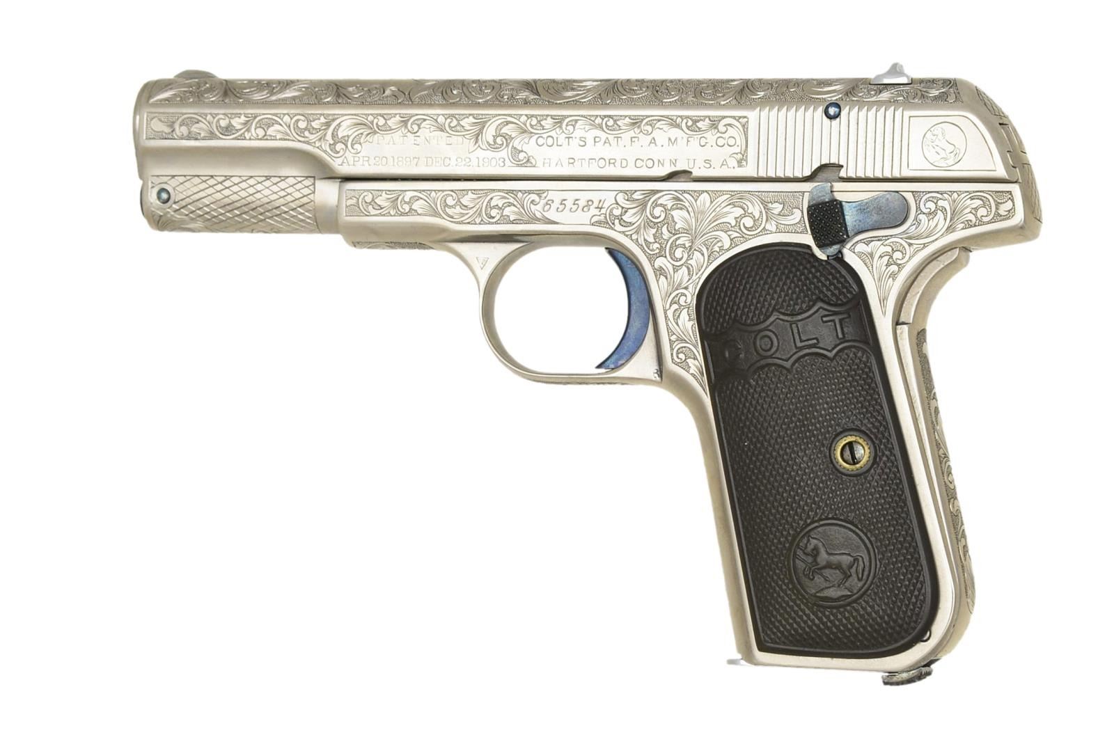 Cal. 32 ACP. S# 65584. Bbl. 4". Beautifully executed full coverage custom aftermarket engraving. Sides of frame & slide as well as top of slide have vine type foliate scroll w/ stippled backgrounds & straight line borders. Matching engraving extends to backstrap, front grip strap, trigger guard bow, bottom of frame & slide. Back of frame, slide & lower portions of slide have diagonal cross hatch designs. Custom nickel finish w/ fire blued hammer, safety, screws & pins. Semi circular front sight w/ fixed U notch rear sight. 2 Piece checkered hard rubber Colt marked repro. grips w/ Rampant Colt motifs. MAGS: 1 detachable 8 rd. w/ added nickel finish. UNATTACHED ACCESSORIES: Protecta-gun box. CONDITION: over 99% custom finish. Very good repro. grips. Lightly pitted bore w/ worn rifling. (21-986/DS). CURIO. $700-1,100.