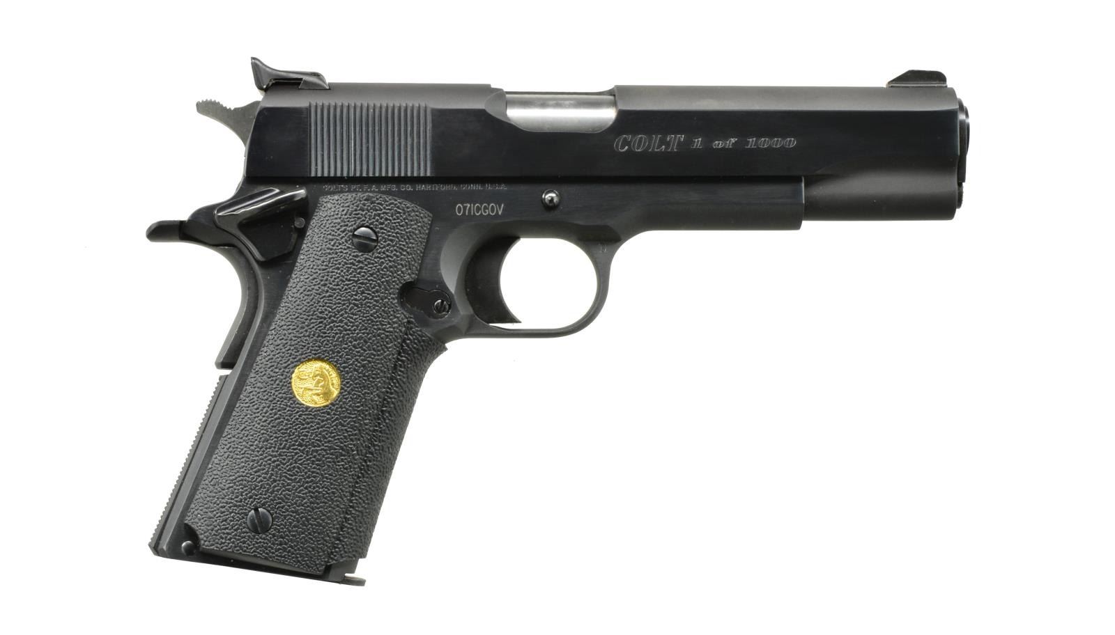 Cal. 45 ACP. S# 071CGOV. Bbl. 5”. Mfg. 1989 as 1 of 1,000 w/ custom features of: beavertail grip safety w/out pad or frame modification, standard sized ambidextrous thumb safety, checkered synthetic mainspring housing, pebble grained wrap around rubber grips w/ gold Colt medallions, synthetic long smooth faced trigger, lowered ejection port w/ flare plus Millett sights; orange faced stake on front & white outline windage adj. rear. Right side of slide marked “COLT 1 of 1000”. Left side has rampant Colt & top of Hartford dome w/ left marked “CUSTOM / - COLT -“ & right marked “GOVT. 45 / -AUTO-“. Standard blued finish having matte edges. MAGS: Colt marked 8 rd. w/ matte finished base area. UNATTACHED ACCESSORIES: maroon factory box w/ styrofoam inserts & packaging. Good plus w/ typical scuffs & wear. End label correct matching numbered labeled “CUSTOM GOVERNMENT” w/ blank label applied over named label. CONDITION: all aspects near excellent; appears new & unfired. (20-4191/NW). MODERN. $1,000-1,500.