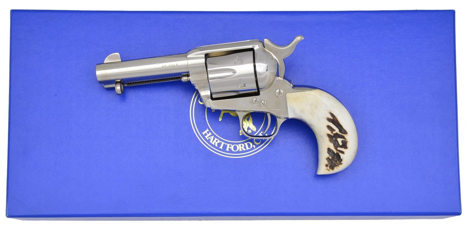 Cal. 45 Colt. S# S41467A. Bbl. 4" w/ ejector & blade front sight. 6 Shot fluted cyl. Full nickel finish. 1 Piece stag bird's head grip. UNATTACHED ACCESSORIES: original 2 piece blue box w/ white sleeve having matching label. Box contains instruction manual, purchaser's card, service work card, hang tag, MA warning card & trigger lock. Colt Archive Properties letter from Historian Beverly Jean Haynes listing the following information "Serial Number: S41467A / Caliber: .45 Long Colt / Barrel Length: 4" - with ejector / Finish: Nickel / Type of Stocks: One-piece stag without medallions / Special Features: Furnished with a birdshead backstrap configuration, a two-line barrel address, the "45 COLT" rollmark, and a blackpowder style frame" / Shipped to James Reis / Address: 3515 Hwy. 54 Osage Beach, Missouri / Date of Shipment: March 2, 2007 / Number of Same Type Guns in Shipment: 1 / Remarks: The records further indicate that subject revolver was displayed at the 2006 NRA Show in Milwaukee, Wisconsin and at the 2007 Antique Arms Show in Las Vegas, Nevada". CONDITION: near new retaining over 99% finish showing a slight cyl. drag line. Bright near excellent bore. (20-2401/DS). MODERN. $1,400-1,900.
