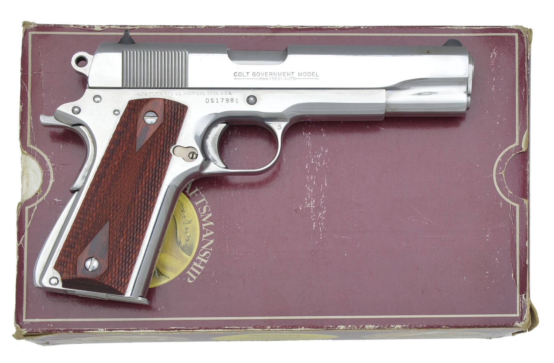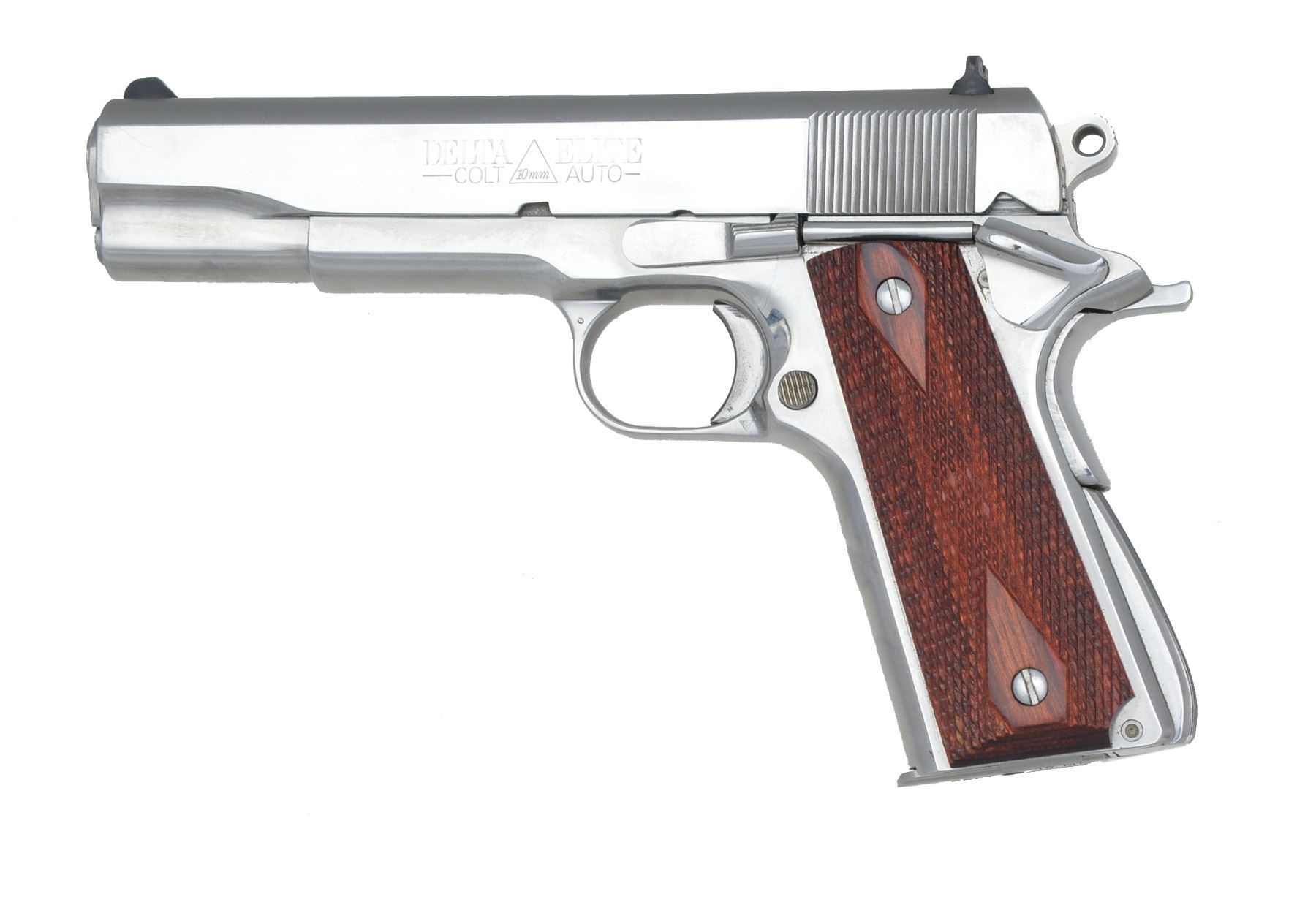 Cal. 10mm. S# DS17981. Bbl. 5". 3 Dot sights. Ultimate bright stainless finish. 2 Piece diamond checkered rosewood grips. Mfg. 1990. MAGS: 2 detachable 8 rd., 1 blue & 1 stainless. UNATTACHED ACCESSORIES: original foam lined box, sleeve has detached end flap. 1 Set of original 1 piece neoprene grips w/ silver Rampant Colt medallions, 1 set of 1 piece Pachmayr Signature rubber grips & 1 set of Pachmayr Gripper 2 piece grips. CONDITION: 98% bright finish showing scattered light scratches & marks. Very good grips. Bore is bright w/ strong rifling. (20-153/DS). MODERN. $800-1,100.