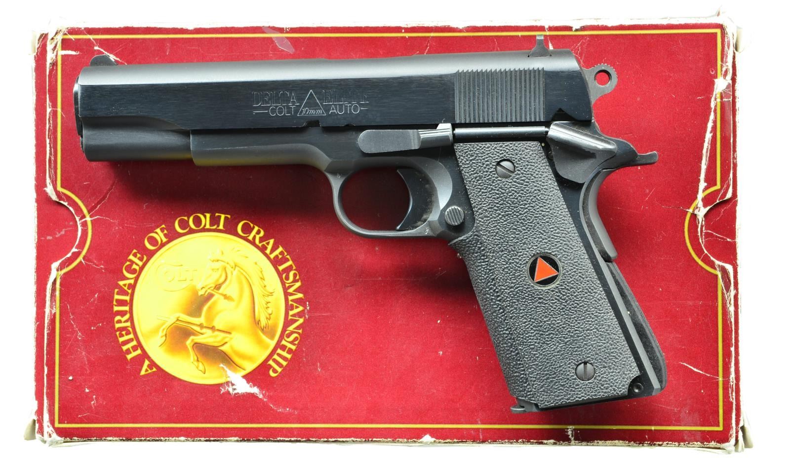 Cal.10mm. S# DE12547. Bbl. 5". 1987 mfg. with fixed 3 white dot sights, Commander hammer, black neoprene grips with circled red triangle logo. MAGS: 1-8 rd. factory. UNATTACHED ACCESSORIES: Colt factory box serial numbered to the pistol with foam insert, manual and paperwork. CONDTION: metal retains about 97% polished and matte blue finish; grips have strong texture and the box shows edge and corner wear with scuffs and small tears. Bore is very good plus, bright and strong. (22-3984/CW). MODERN. $1,000-1,200.