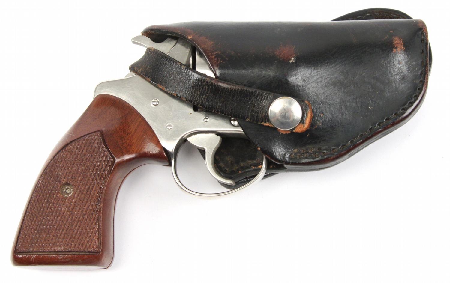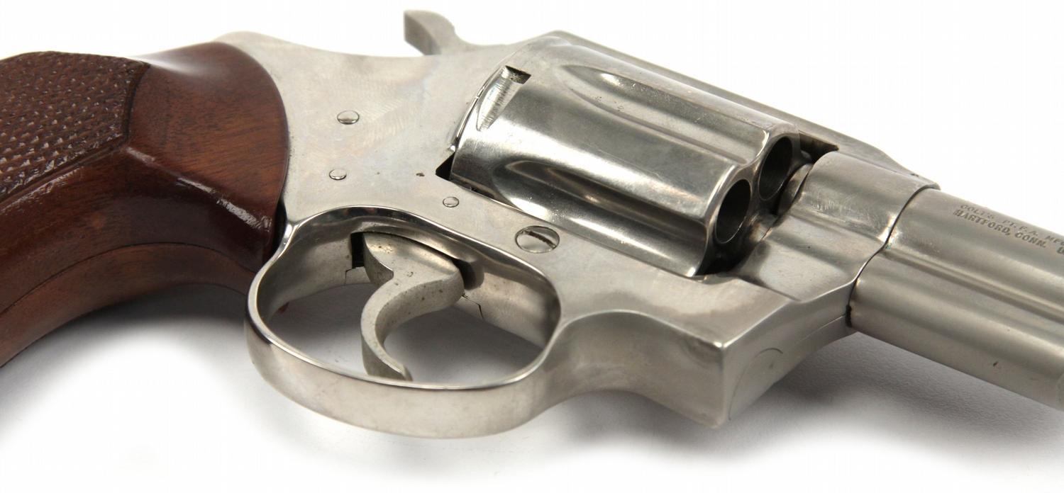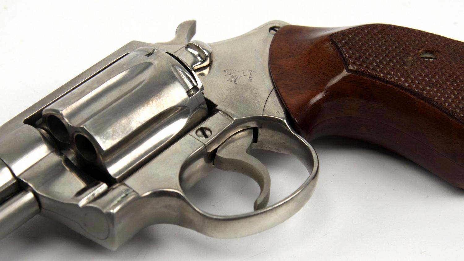 Colt Detective Special revolver, in .38 Special. Six shot cylinder, with 2 inch barrel, wood grips, and nickel finish. Serial number indicates 1974 manufacture. Bore is bright and clean, and grips are good, with handling wear. Nickel finish shows some holster wear and discoloration. Overall very good condition. Sold with Mixon Leathercraft holster. s# F13801