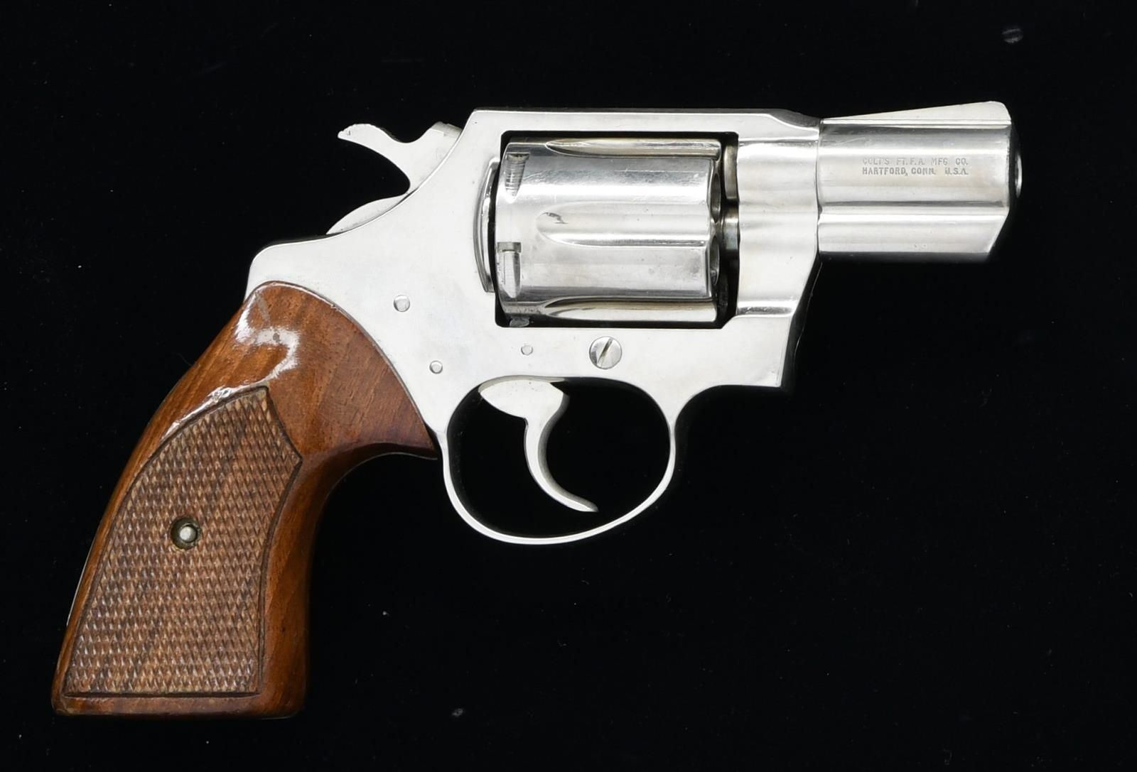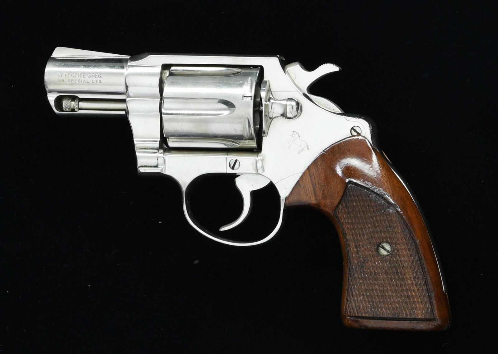 Cal. 38 Spl. S# F27545. Bbl. 2". Ramped blade front sight. Fixed rear sight. Mfg. 1974. Nickel finish. Checkered hardwood grips. UNATTACHED ACCESSORIES: finger groove hardwood grips that show some dings & handling wear. CONDITION: checkered grips show scattered flaking varnish, dings, scratches & handling wear. Metal retains a high degree of original nickel w/ a couple small spots of oxidation, a drag line on cyl., some dings & scattered scratches. Very good bright bore. (23-5070/MJC). MODERN. $500-750.