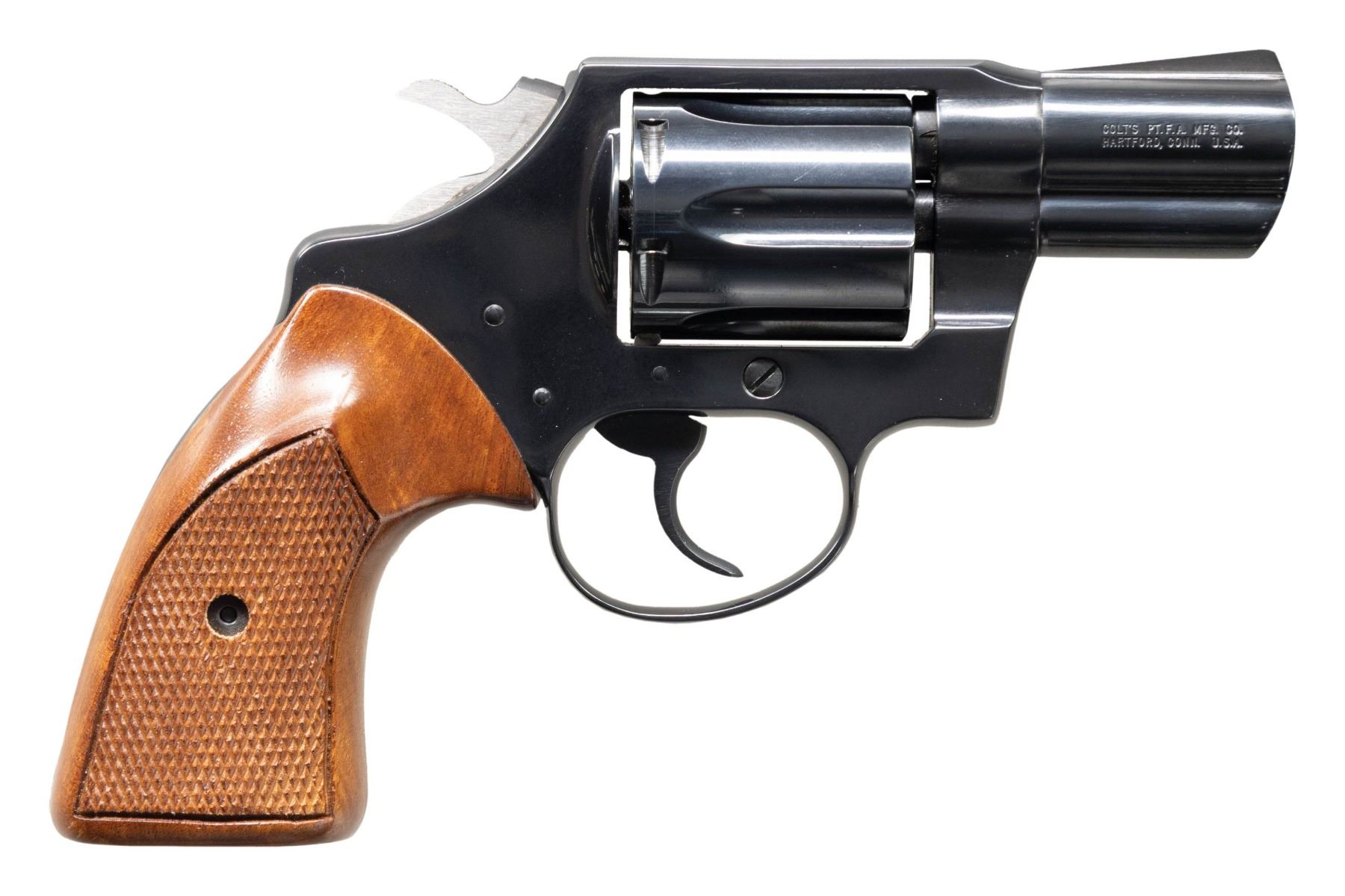 Cal. 38 Spec. S# F34246. Bbl. 2 1/8". Detective Special double action revolver mfg. by Colt in 1974. Left side of the bbl. is marked with the model and cal. designations, with Colt's 2-line address marked on the right. Left side of the frame is marked with the Rampant Colt logo. Metal components exhibit a blue finish overall, save for on the sides of the hammer, which are polished in-the-white. Frame is mounted with 2-piece aftermarket checkered wood grips. Ramped blade front sight with square notched rear sight. Matching numbers are present on the frame and cyl. crane. CONDITION: metal components retain virtually all of their original factory blue finish, save for a few light scratches and superficial handling marks. Cyl. exhibits a light dragline. Mirror bore, retaining well defined rifling throughout. Proper manual mechanics in SA and DA modes. Grips show a few minor marks and small impressions, but are otherwise sound. (25-5209/MLW). CURIO. $600-900.