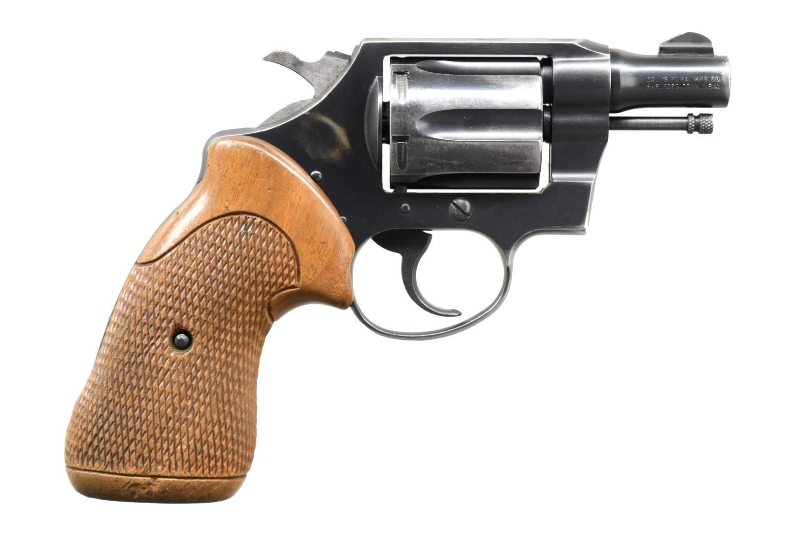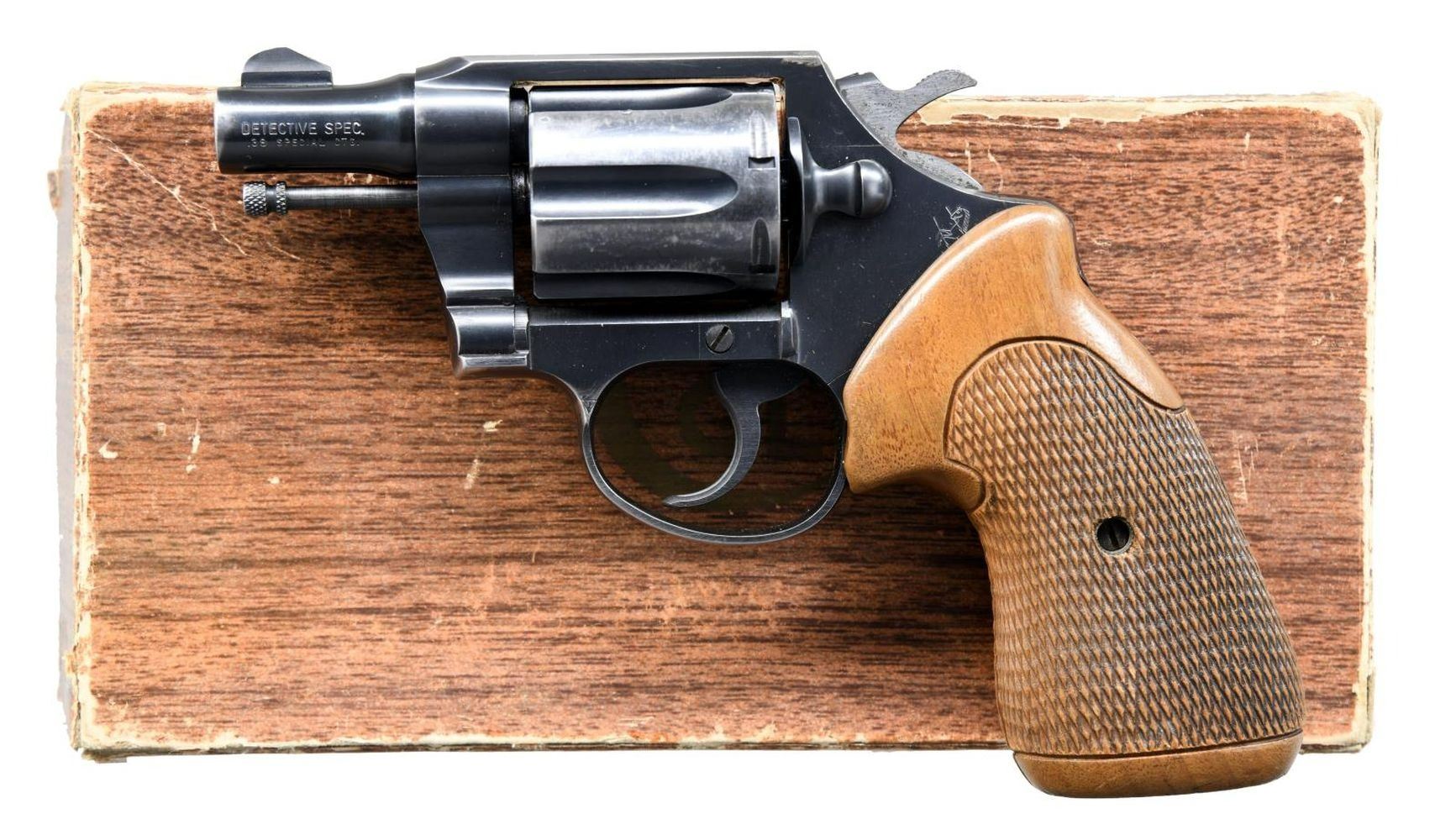 Cal. 38 Spl. S# 770028. Bbl. 2". Detective Special DA revolver mfg. by Colt in 1960. Left side of bbl. is marked with the model and cal. designations, with Colt's 2 line address across the right. Left side of frame is marked with the Rampant Colt logo and "VP" proof. Blued finish with 2 piece checkered wood aftermarket grips. UNATTACHED ACCESSORIES: factory box matching in handwritten marker on the bottom panel. CONDITION: metal components retain the majority of their original factory blue finish, exhibiting areas of wear and thinning that show through to gray patina, with some scattered spots of light surface oxidation. Mirror bore, exhibiting strong rifling throughout. Grips show some scattered marks from handling and storage, but otherwise remains sturdy and serviceable. Box exhibits exterior wear, with tearing at the corners of the lid. (23-4977/MLW). CURIO. $350-550.