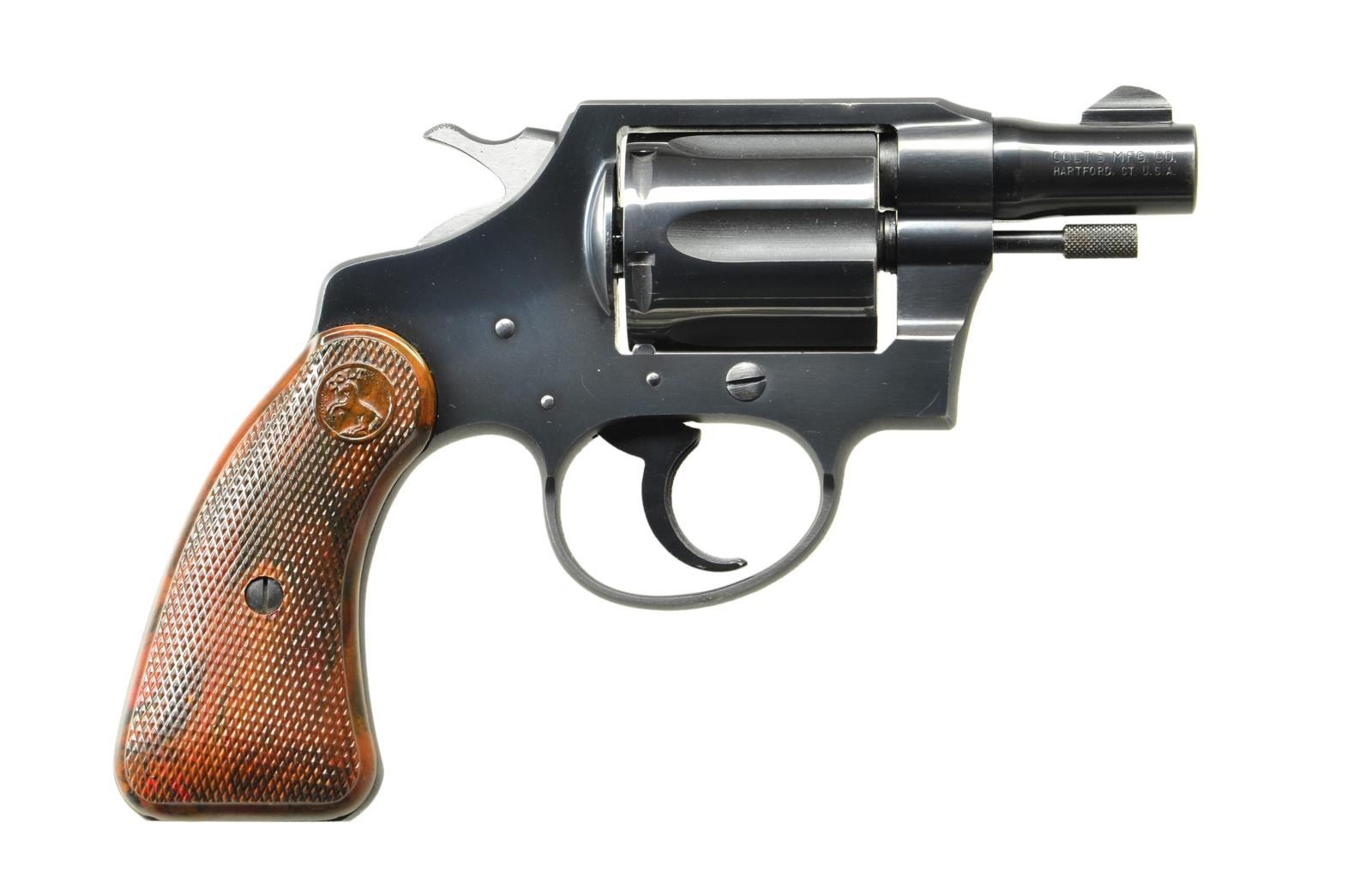 Cal. 38 Spl. S #534392. Bbl. 2". Serrated front sight. 6 shot cyl. 2nd issue revolver. 1949 mfg. Blue finish. Serial number has white highlight. Coltwood checkered grips. CONDITION: grips show light handling wear. Metal retains 95% original blue w/ handling & operational wear. Near excellent bore. (22-3576/MJC). CURIO. $400-600.