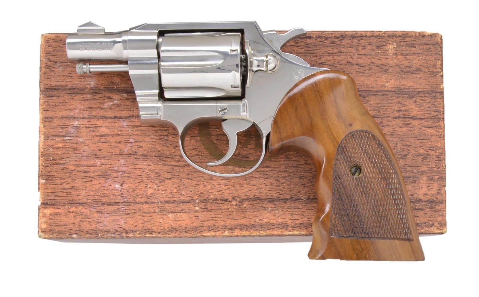 Cal. 38 Spl. S# 758979. Bbl. 2". Mfg. 1960. Serrated ramp front sight. 6 shot swing out cyl. Nickel finish. Unmarked walnut finger groove grips. UNATTACHED ACCESSORIES: factory box end-labeled to gun w/ paperwork & a worn Official Folsom Audley holster that shows flaking & overall staining. CONDITION: right grip panel has a small filler repair at top, grips show light handling wear. Metal retains 97% original nickel finish. Near excellent bore. (22-4310/MJC). CURIO. $400-600.