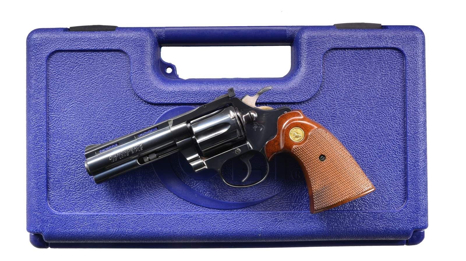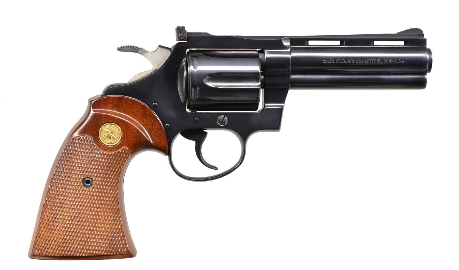 Cal. 22 LR. S# R05837. Bbl. 4" w/ VR & full lug. Serrated ramp front sight w/ square notch adj. rear sight. 6 Shot fluted cyl. Full blue finish. 2 Piece checkered target walnut grips w/ Rampant Colt medallions. 1977 Mfg. UNATTACHED ACCESSORIES: Colt blue molded box w/ instruction manual, purchaser's card & congratulations letter. CONDITION: near new retaining over 99% wood & metal finish. Bright near excellent bore. Smooth mechanics. (20-2408/DS). MODERN. $1,200-1,800.