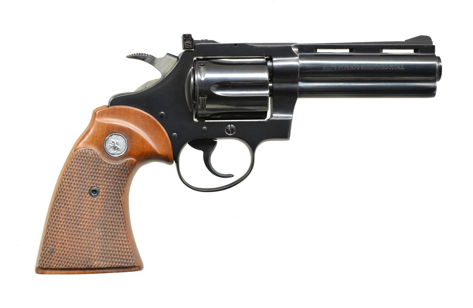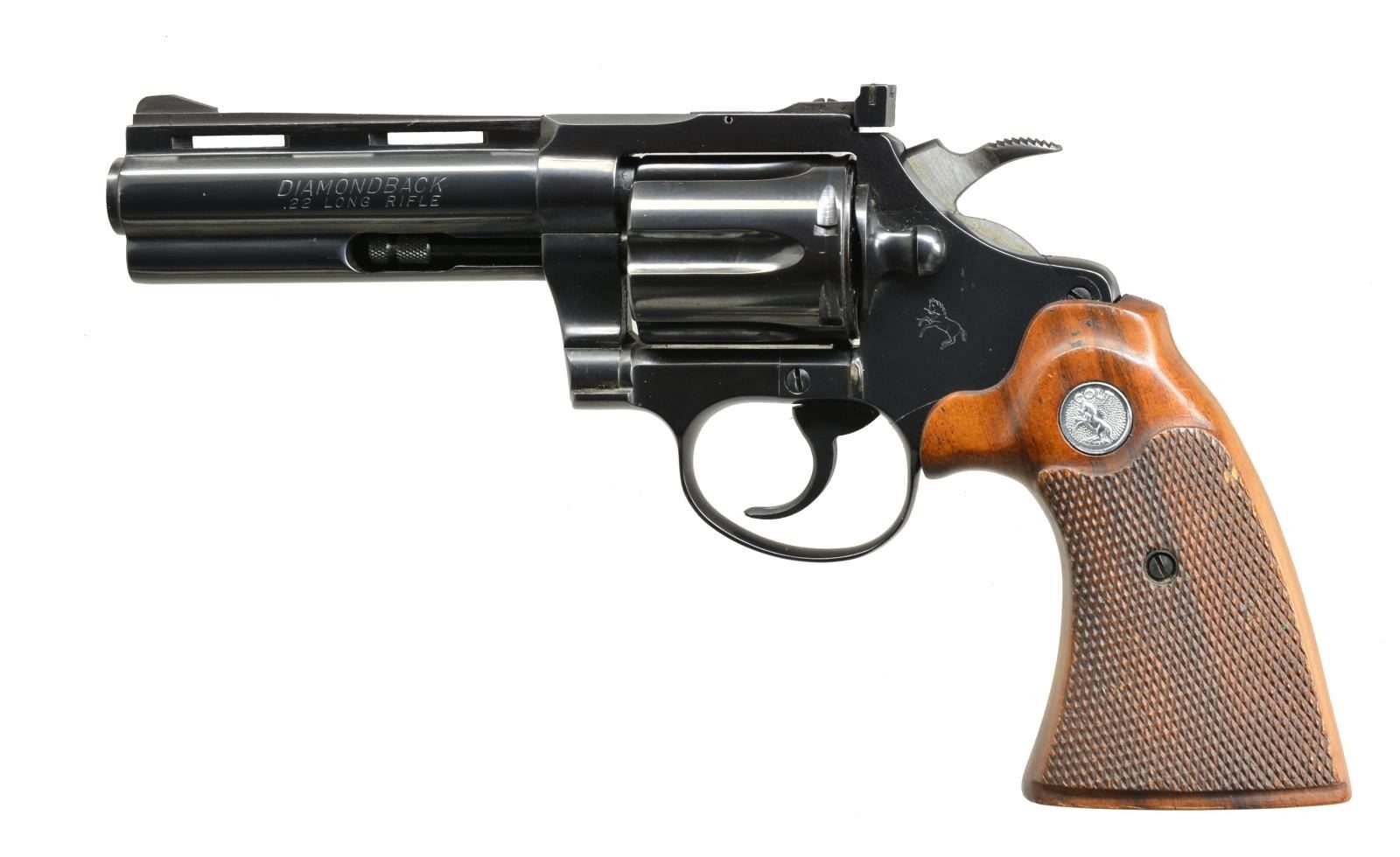 Cal. 22 LR. S# D42345. Bbl. 4" w/ VR & full ejector lug. Serrated ramp front sight w/ square notch adj. rear sight. 6 Shot fluted cyl. Blued finish. 2 Piece checkered walnut grips w/ Rampant Colt medallions. 1970 Mfg. CONDITION: over 95% blue showing cyl. drag line & light edge wear. Grips show light wear & marks. Bright near excellent bore. (20-3229/DS). MODERN (Not CURIO until Jan.1, 2021). $800-1,200.