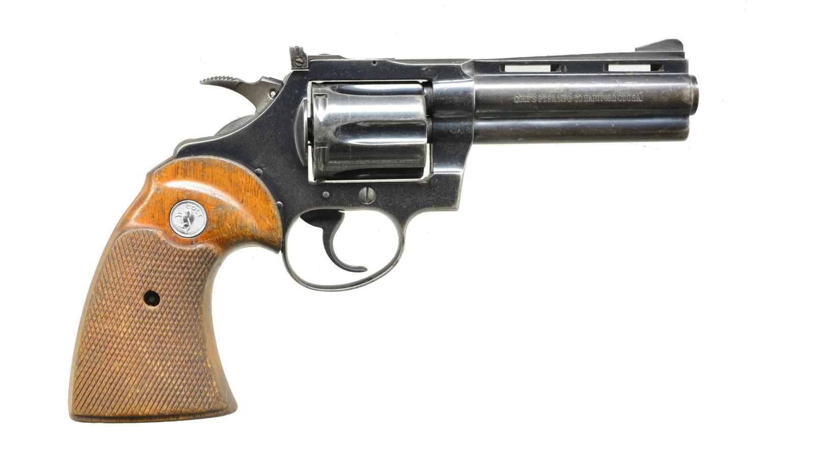 Cal. 38 Spl. S# D21001. Bbl. 4" w/ full lug & VR. Serrated ramp front sight & square notch adj. rear sight. 6 Shot fluted cyl. Blue finish. 2 Piece checkered walnut target grips w/ Rampant Colt medallions. 1968 Mfg. CONDITION: 70% dull worn blue showing edge wear, spots of freckling & corrosion. Grips have worn appearance w/ peeling finish, checkering shows some chipped diamonds. Smooth mechanics. Bright bore w/ strong rifling. (20-3944/DS). CURIO. $500-700.