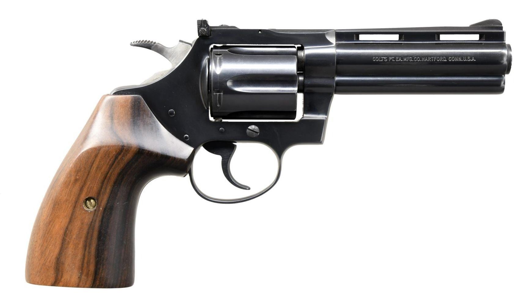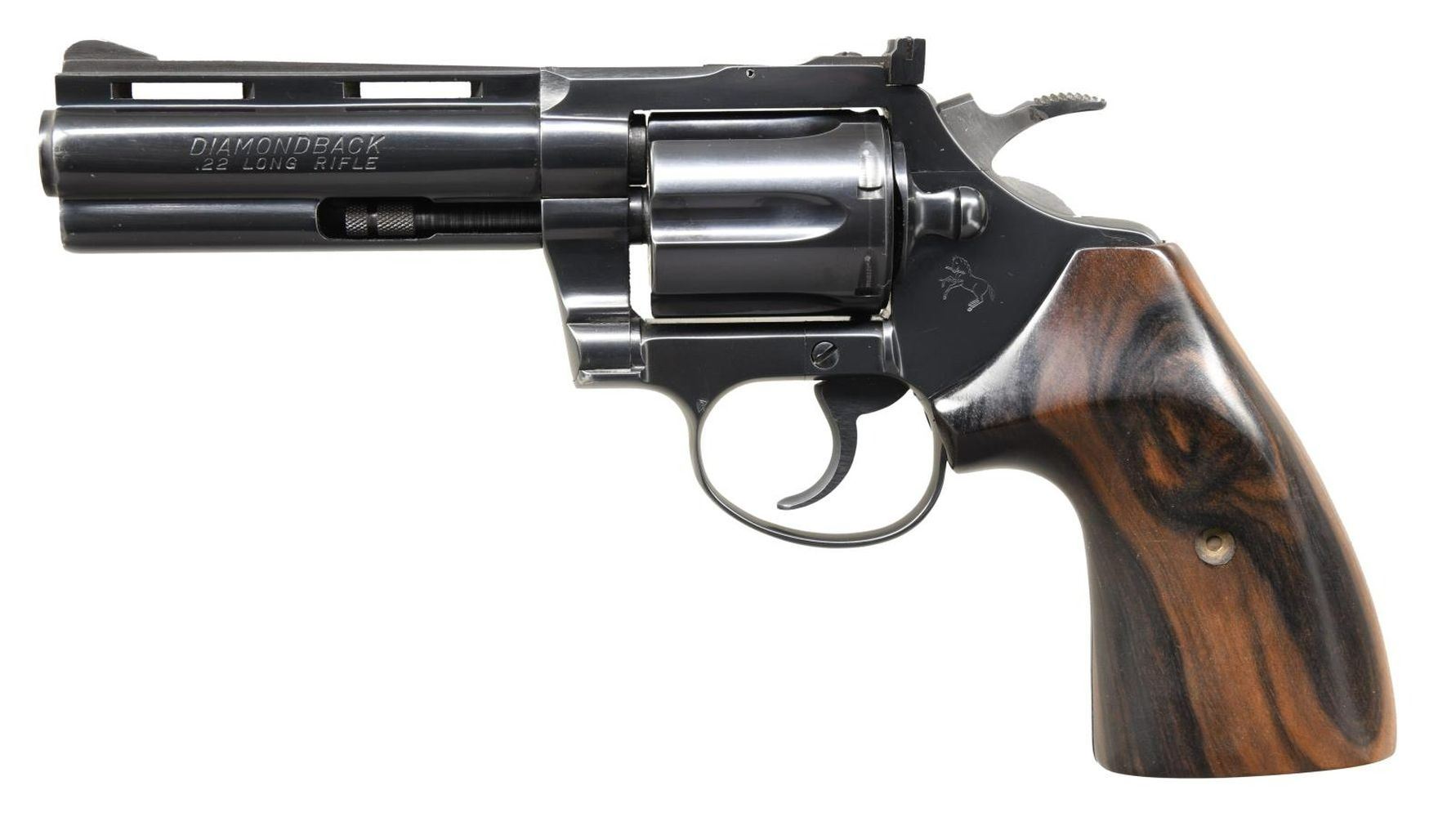 Cal. 22 LR. S# N04879. Bbl. 4". Diamondback DA revolver mfg. by Colt in 1977. Left side of bbl. is marked "DIAMONDBACK/ .22 LONG RIFLE", with Colt's single line address across the right. Left side of frame exhibits the Rampant Colt logo and "VP" proof. Metal components exhibit a blued finish, with the frame being mounted with 2 piece aftermarket smooth wood grips. Vent rib with grooved ramp front sight and adjustable square notch rear sight. CONDITION: very good, with metal components retaining the majority of their original factory blue finish overall, with a few light superficial marks from handling and storage, as well as some light wear on the ejector rod from cycling. Mirror bore, exhibiting well defined rifling throughout. Grip shows a few light handling marks, but is otherwise very good overall. PROVENANCE: The Collection of Gun Sport Ltd owned by Jon R. Thomas. (23-4584/MLW). MODERN. $800-1,200.