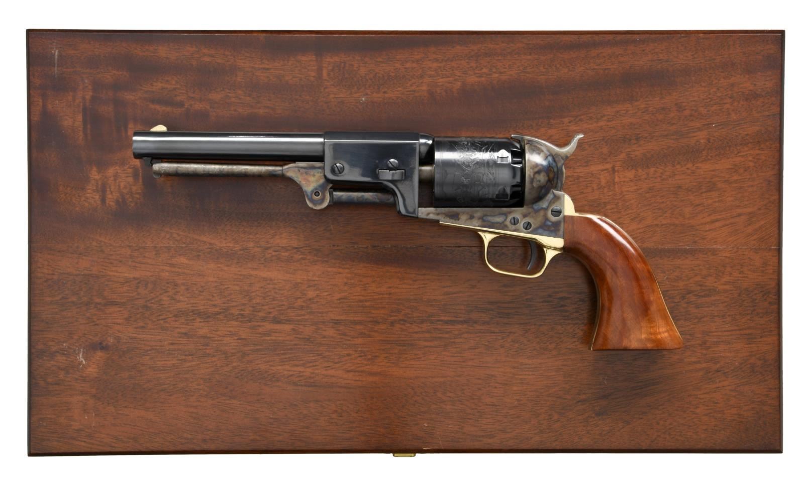 Cal. 44. S# 35635. Bbl. 7 1/2". Brass blade front sight. Case colored frame, hammer & loading lever. Gold finished trigger guard & grip frame. Blued bbl. & cyl. Cyl. has Indian & cowboy scene. Walnut grips. UNATTTACHED ACCESSORIES: Colt Heritage wooden display case & key. CONDITION: all aspects rate very good or better w/ a few spots of oxidation on metal. PROVENANCE: From the personal collection of Brad Shepherd. (01-23789/MJC). ANTIQUE. $400-700.