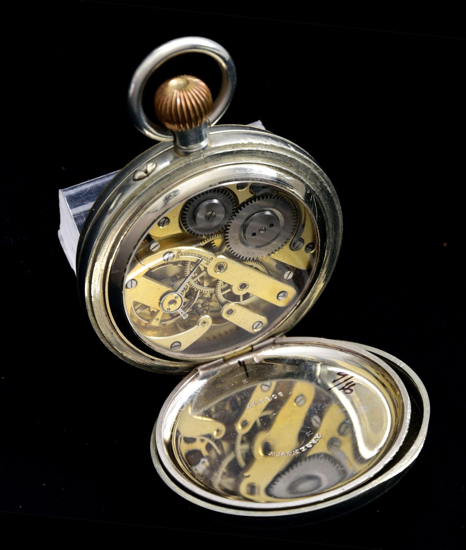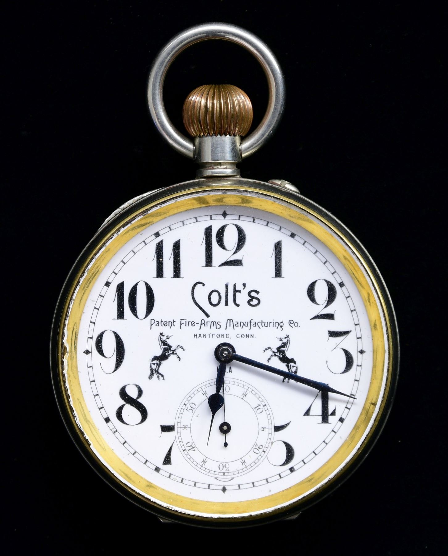 An interesting large size pocket watch measuring 2 1/2" in diameter with a black and white face that features two rampant horses and the words "Colt's Patent Fire-arms Manufacturing Co. Hartford, Conn U.S.A". The face has oversized numbers with a bottom second hand dial. It is a stem wind watch with the inside of the outer case marked "ARGENTAN SWISS 306347". The inside of the inner case is marked "ARGENTAN 306347 H". There are also several service marks on the inside of the inner case. The movement is protected by glass and is unmarked. CONDITION: the watch does seem to run for varying periods of time. Undoubtedly, a cleaning and oiling would do wonders for this watch. There are superficial scratches to the case and the edge of the face has a few minor wear chips. A beautiful and impressive piece for the Colt collector. (02-24316/BF). $500-1,500.