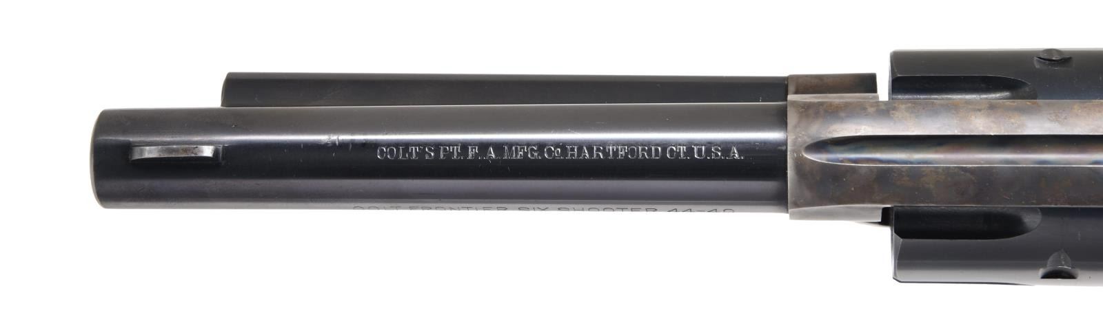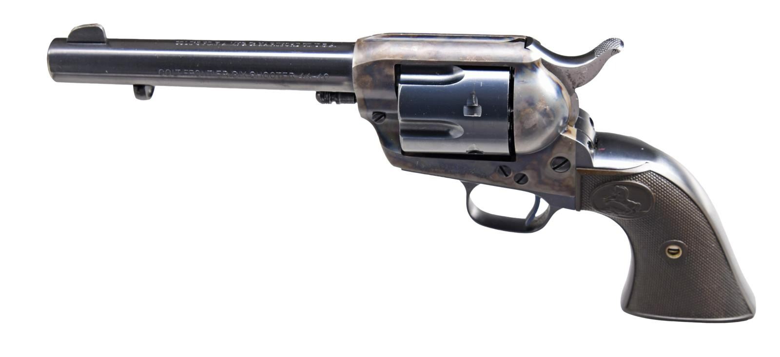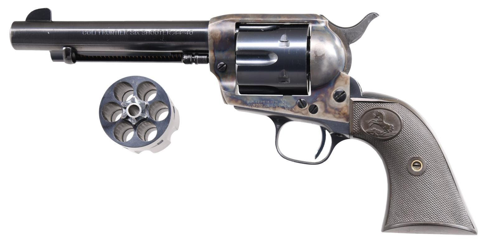 Cal. 44 WCF (44-40) w/ extra 44 Spl cyl. S# 356416. Bbl. 5 1/2". Six shot fluted cyls. Blue & case colored finish. 2 piece checkered hard rubber rampant colt grips. Mfg. 1938. CONDITION: fine. Bbl., cyls. & grip strap retain 97% original blue showing light muzzle wear w/ carry wear on backstrap. 44-40 cyl. shows a light cyl. drag line. Frame retains 95% bright case colors. Very good grips. Bright near excellent bore. (24-977/DS). CURIO. $5,000-8,000.