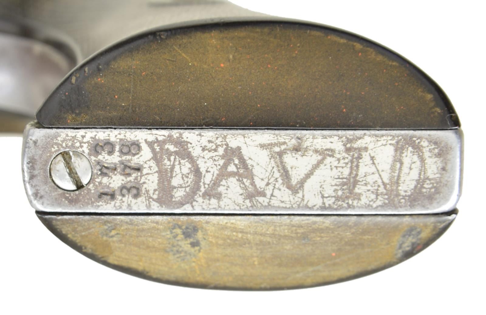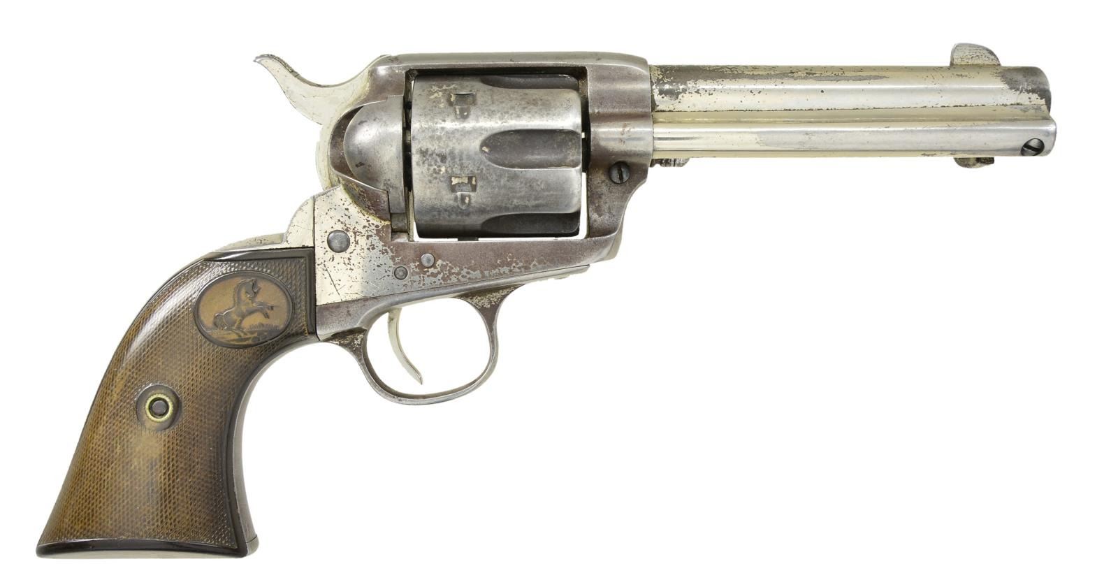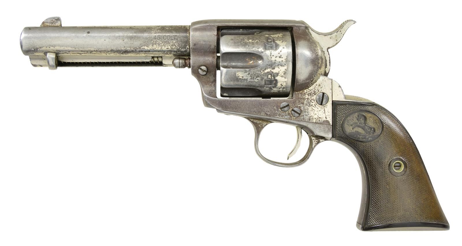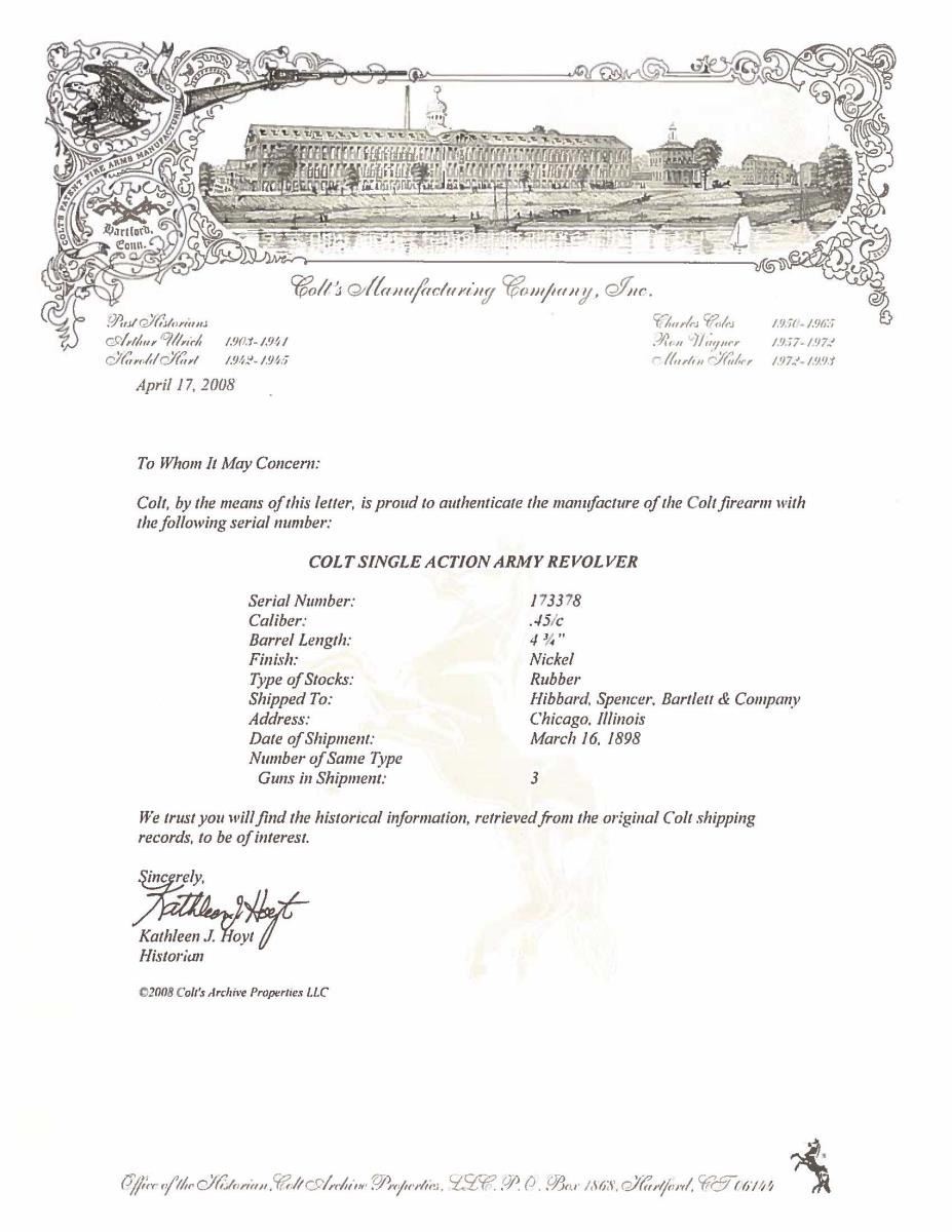 Cal. 45 Colt. S# 173378. Bbl. 4 3/4" with blade sight. 6 Shot fluted cylinder. Full nickel finish. 2 Piece checkered hard rubber Rampant Colt grips. Butt has hand scratched name "DAVID". Mfg. 1898. UNATTACHED ACCESSORIES: Colt factory letter providing the following information "Serial Number: 173378 / Caliber: .45/c / Barrel Length: 4 3/4" / Finish: Nickel / Type of Stocks: Rubber / Shipped To: Hibbard, Spencer, Barlett & Company / Address: Chicago, Illinois / Date of Shipment: March 16, 1898 / Number of Same Type Guns in Shipment: 3". CONDITION: 30% nickel finish blending with gray/brown patina. Grips show heavy wear. Functioning action. Dark bore showing some light pitting retains intact rifling. (01-21439/DS). ANTIQUE. $1,500-2,500.