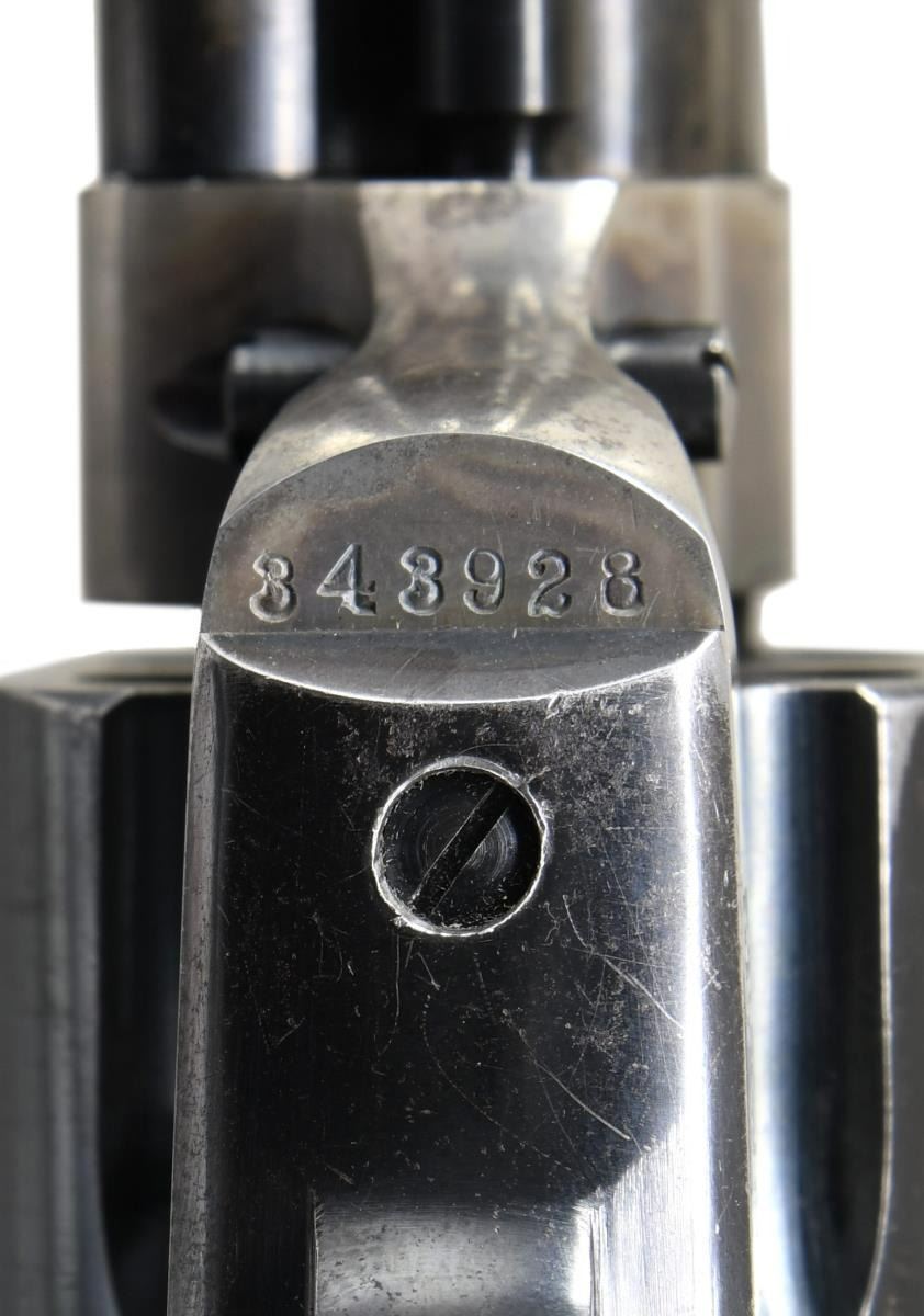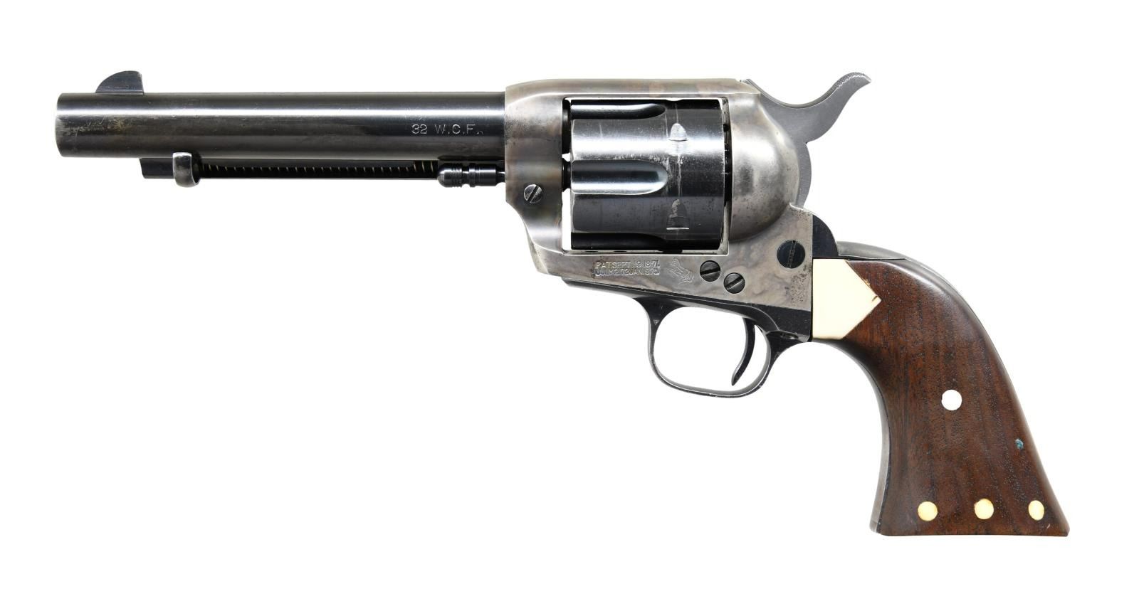 Cal. 32 WCF (32-20). S# 343928. Bbl. 5 1/2". Six shot fluted cyl. Blue & case colored finish. 1 piece walnut grips have added white colored ornamentation consisting of 4 circular dots on each panel w/ triangular inlay at the action. UNATTACHED ACCESSORIES: letter from the Office of the Colt Historian detailing the following information, "Serial Number: 343928 / Caliber: .32/20 / Barrel Length: 5 1/2" / Finish: Blue / Type of Stocks: Not Listed / Shipped To: Schmelzer Arms Company / Address: Kansas City, Missouri / Date of Shipment: October 25, 1922 / Number of Same Type Guns in Shipment: 2". CONDITION: bbl., cyl. & grip straps retain over 70% original blue showing carry wear & spots of light pitting. Frame has 70% lightly visible case colors w/ spots of corrosion. Grips are refinished. Very good bore. (24-975/DS). CURIO. $2,000-3,000.