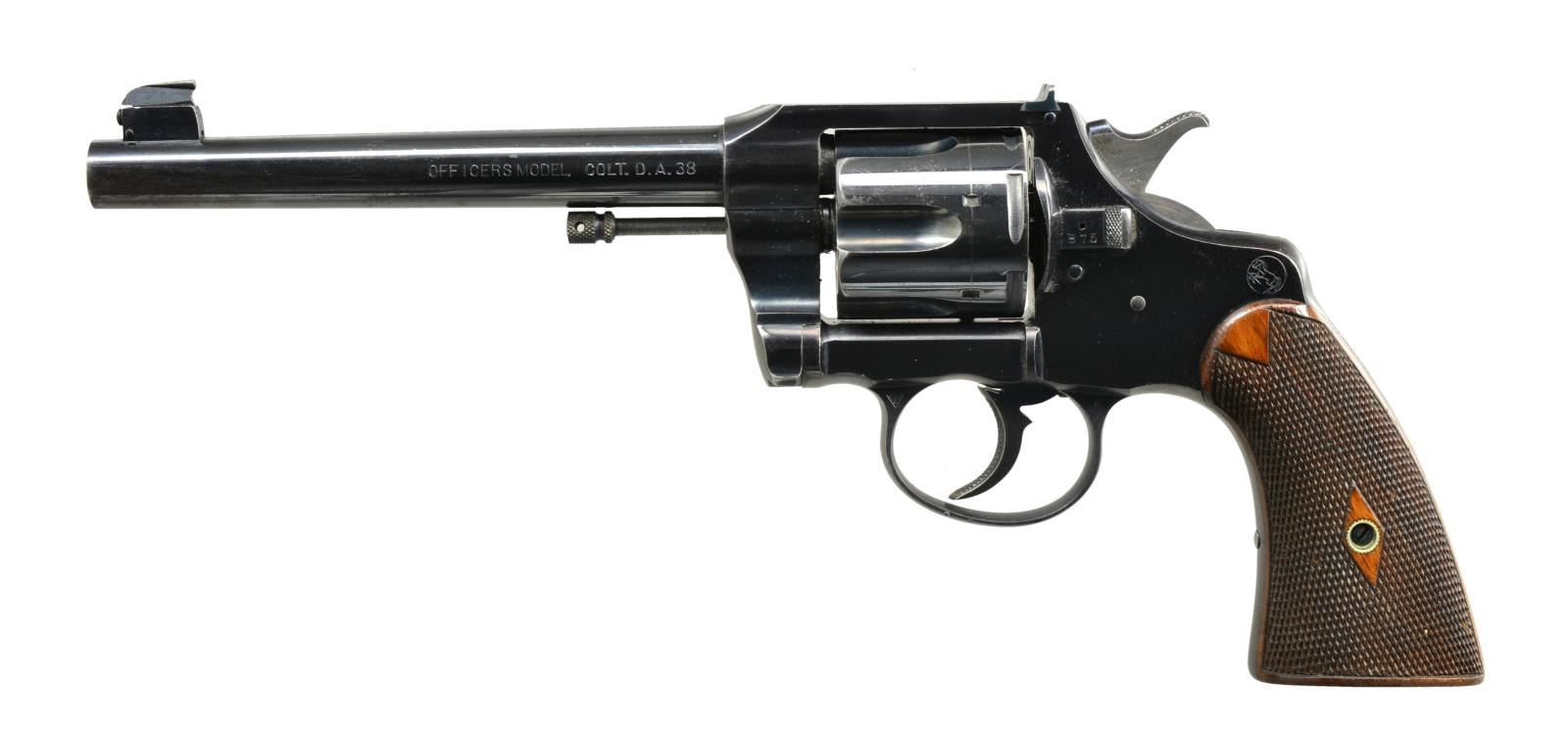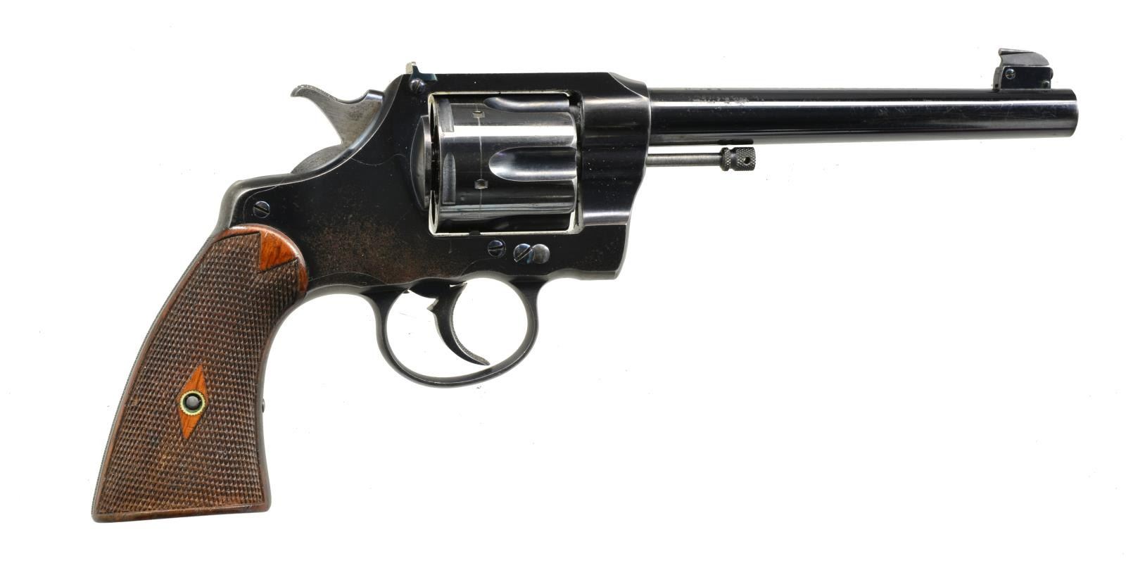 Cal. 38 Colt. S# 251035. Bbl. 6" w/ adj. bead front sight & adj. U notch rear sight. 6 Shot short flute cyl. w/ counter clockwise rotation. Bright blue finish. Checkered backstrap. 2 Piece checkered walnut grips. 1905 Mfg., produced 1904-1908. CONDITION: over 85% blue showing light muzzle & edge wear w/ spots of freckling & cyl. drag line. Very good checkering & finish w/ light handling marks. Crisp mechanics. Bright bore w/ sharp rifling. PROVENANCE: The Estate of Richard Willman. (20-2331/DS). CURIO. $900-1,200.