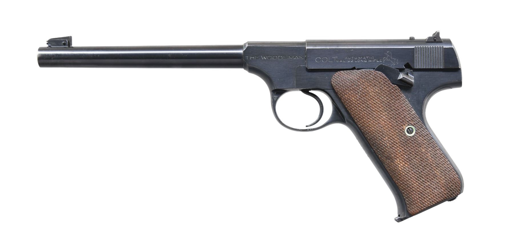 Cal. 22 LR. S# 139041. Bbl. 6 1/2". Adj. sights. 2 piece checkered walnut grips. MAGS: 1 detachable 10 rd. Mfg. 1940. CONDITION: over 90% original blue showing muzzle & edge wear. Grips show light wear w/ a few flattened diamonds. Very good bright bore. (24-5673/DS). CURIO. $700-1,000.