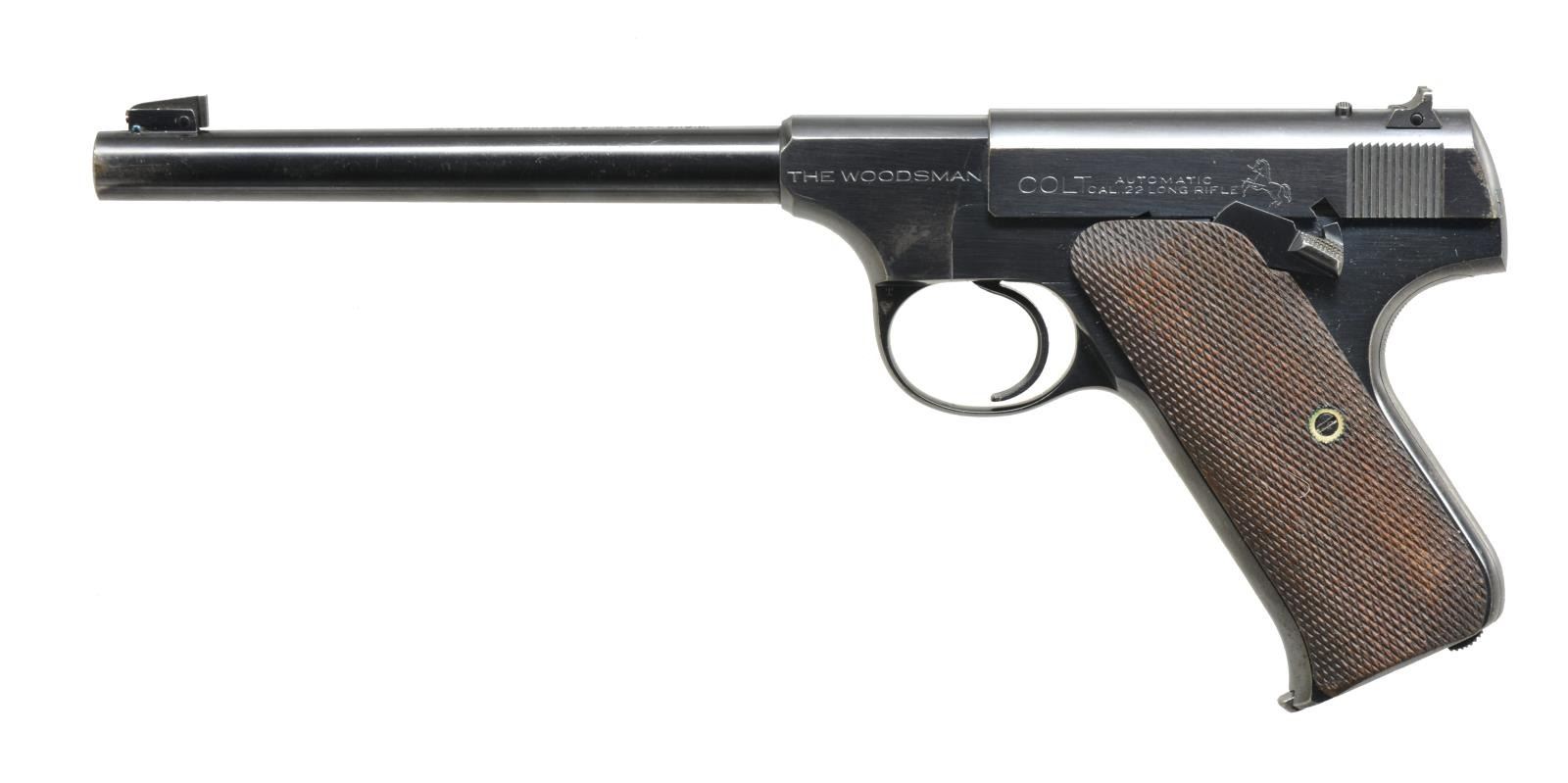 PISTOL. Cal. 22 LR. S# 141835. Bbl. 6 5/8" w/ blade rear sight & adj. square notch rear sight. Blue finish. 2 Piece checkered walnut grips. 1940 Mfg. MAGS: 3 detachable 10 rd. CONDITION: 85% lightly faded blue showing muzzle & edge wear. Grips show moderate wear. Bore is bright w/ strong rifling. PROVENANCE: Collection of Alan Bradley Shepherd. (20-4040/DS). CURIO. $500-800.
