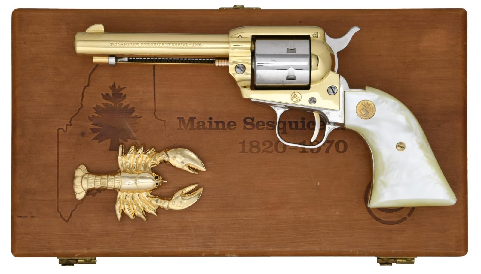 REVOLVER. Cal. 22 LR. S# 2967MES. Bbl. 4 3/4". Blade front sight. Left side of bbl. marked "1820- MAINE SESQUICENTENNIAL 1970". Mfg. 1970 to commemorate the Great State of Maine's 150th year of separation from Massachusetts. Gold plated bbl., ejector rod, trigger & frame. Nickel plated grip frame, hammer & unfluted cyl. Simulated pearl grips w/ silver Colt medallions. UNATTACHED ACCESSORIES: commemorative display box w/ blue satin liner & gold plate lobster insert. CONDITION: all aspects rate very good plus or better w/ some handling wear, light residue from firing & light tarnish on nickel parts. (23-2065/MJC). CURIO. $500-800.