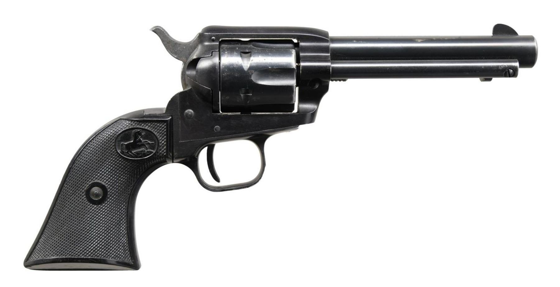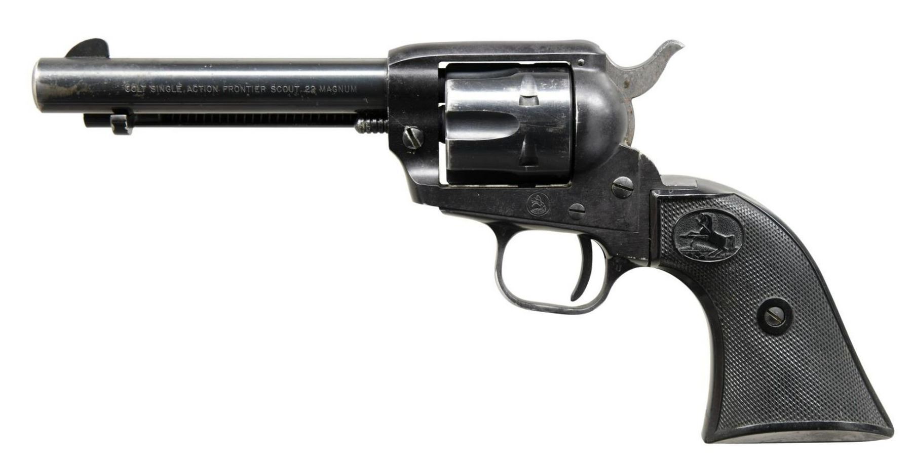 Cal. 22 WMR. S# 118902F. Bbl. 4 5/8". Blade front sight. Fixed rear sight. Mfg. 1960. Blue & anodized finishes. Checkered black rubber grips w/ Rampant Colt. CONDITION: grips show scattered handling wear & some light scratches. Metal retains 75% original finishes w/ a drag line on cyl., some edge wear, scratches on underside of bbl. & some scattered oxidation spots. Very good bore. (23-4693/MJC). CURIO. $350-500.