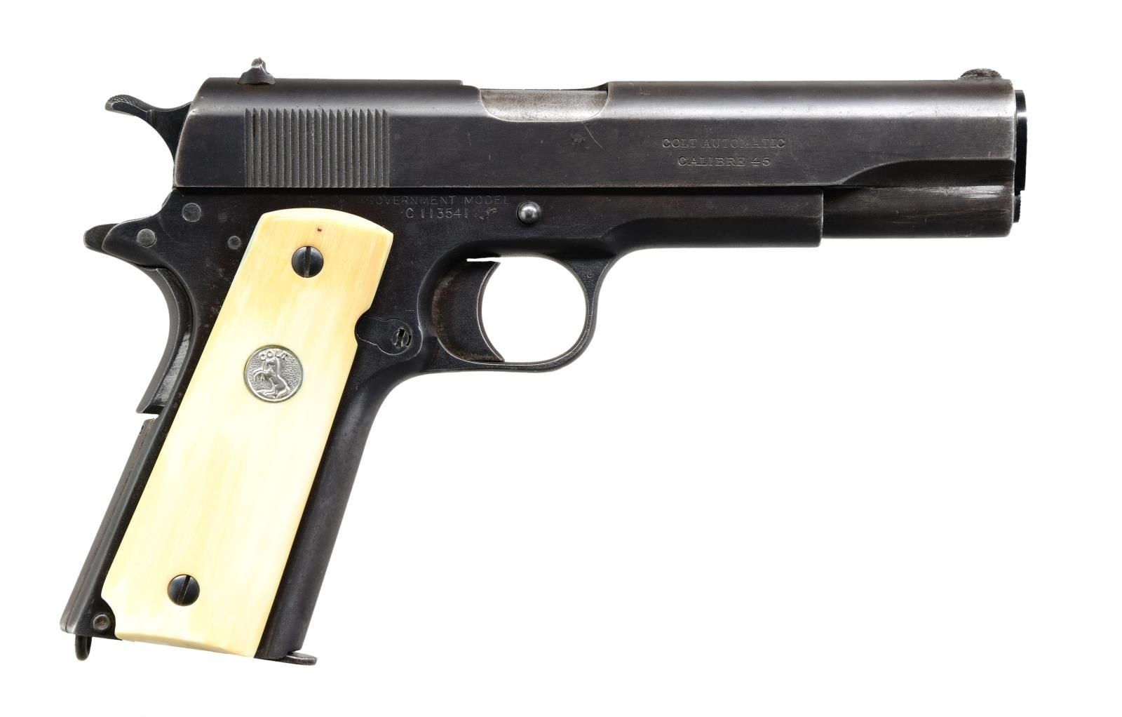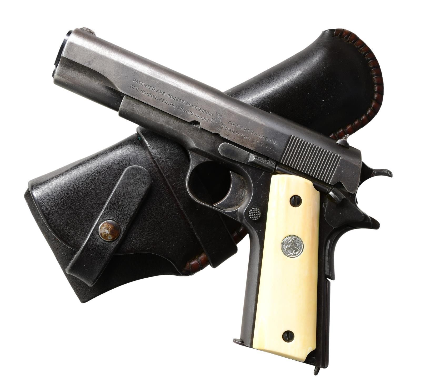 IVORY GRIPS & HEISER HOLSTER. Cal. 45 ACP. S# C113541 (1918). World War I era with 5" barrel. 1911 Controls w/ long trigger & short tang grip safety. Ivory grip panels w/ Colt medallions. MAGS: 1 good 7 rd. with patina & wear. UNATTACHED ACCESSORIES: Heiser of Denver black leather holster stamped "421". Holster very good with light wear. CONDITION: pistol fair dull blue refinish showing large areas of finish loss along with scattered marks, pinprick oxidation & scratches. Good grips show green verdigris & chips on inside around bushings; back of left grip panel shows glue repaired chip. Barrel has good blue w/ cycling wear; good bore w/ strong lands & pitting. (24-628/MD). CURIO. $1,000-1,500.