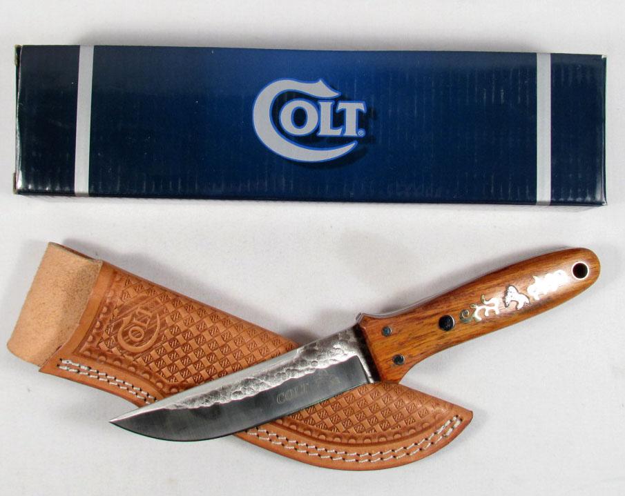 COLT HUNTING KNIFE W/ BRASS SCROLL INLAY ON HANDLE AND SHEATH - Approx. 9.25" long