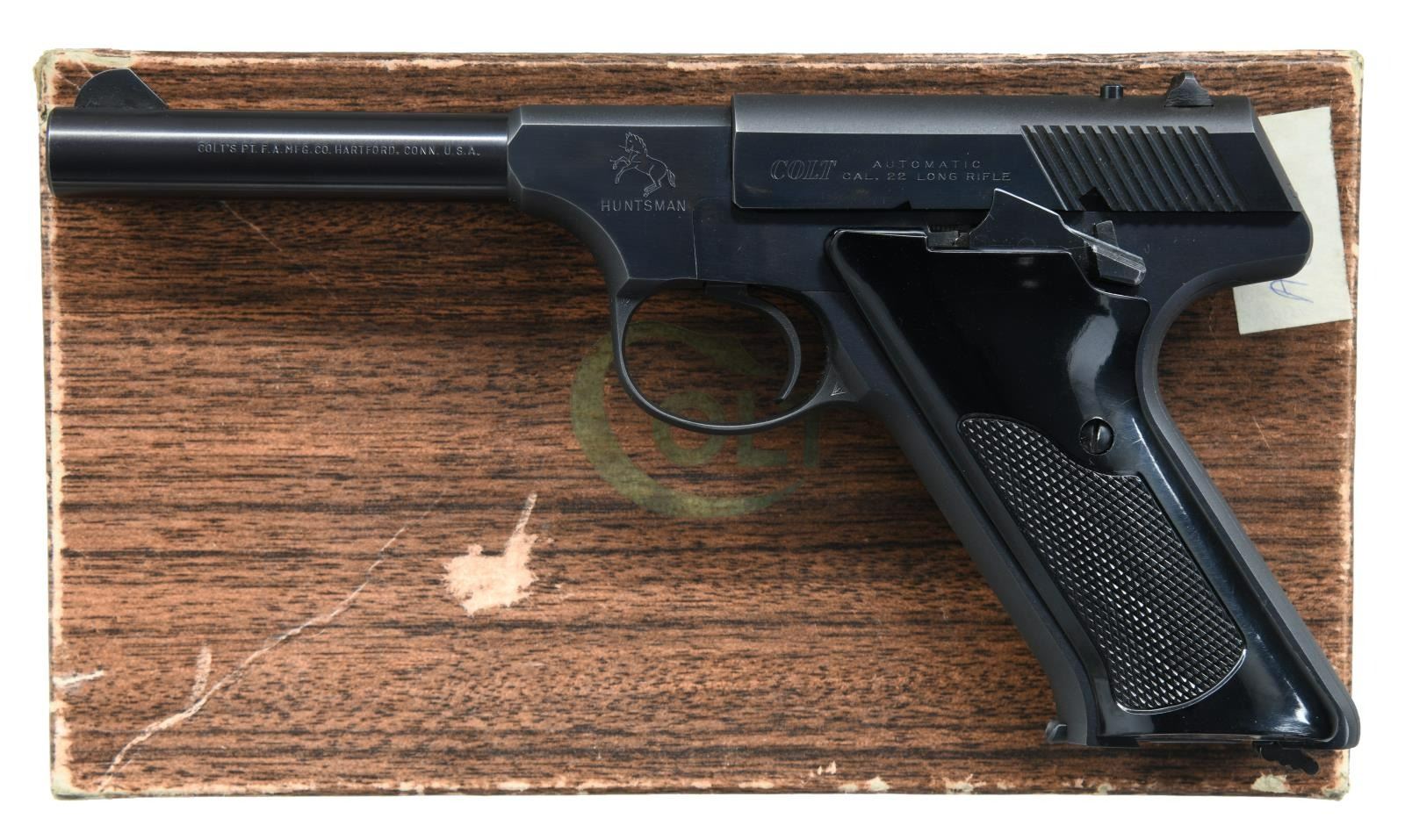 Cal. .22 LR. S# 110435-C. Bbl 4 5/8". Mfg 1956. Left side of bbl is stamped w/ Colt's single line address followed by the Rampant Colt logo above "HUNTSMAN", w/ "COLT" followed by the caliber designation on the slide. Blued finish w/ 2 piece Colt checkered black plastic grips. Fixed serrated front sight w/ fixed square notch rear sight. UNATTACHED ACCESSORIES: original factory box (hand written to match on bottom) containing factory paperwork. CONDITION: very good, w/ metal components retaining the vast majority of their original factory blue finish, exhibiting mild spots of edge wear and a few minor superficial marks from handling and storage. Mirror bore, exhibiting well defined rifling throughout. Grips show a few minor handling marks, but are otherwise very good. Box exhibits exterior wear, but is otherwise sturdy and serviceable. (23-1775/MLW). CURIO. $450-650.