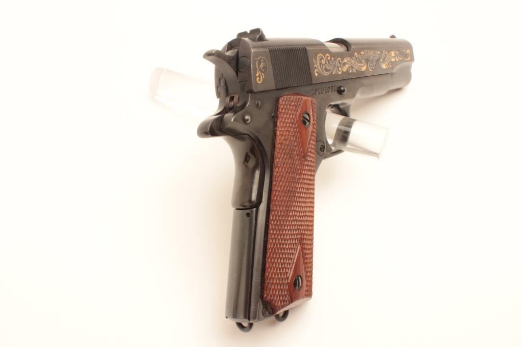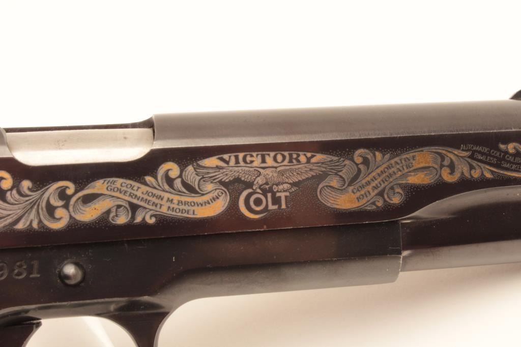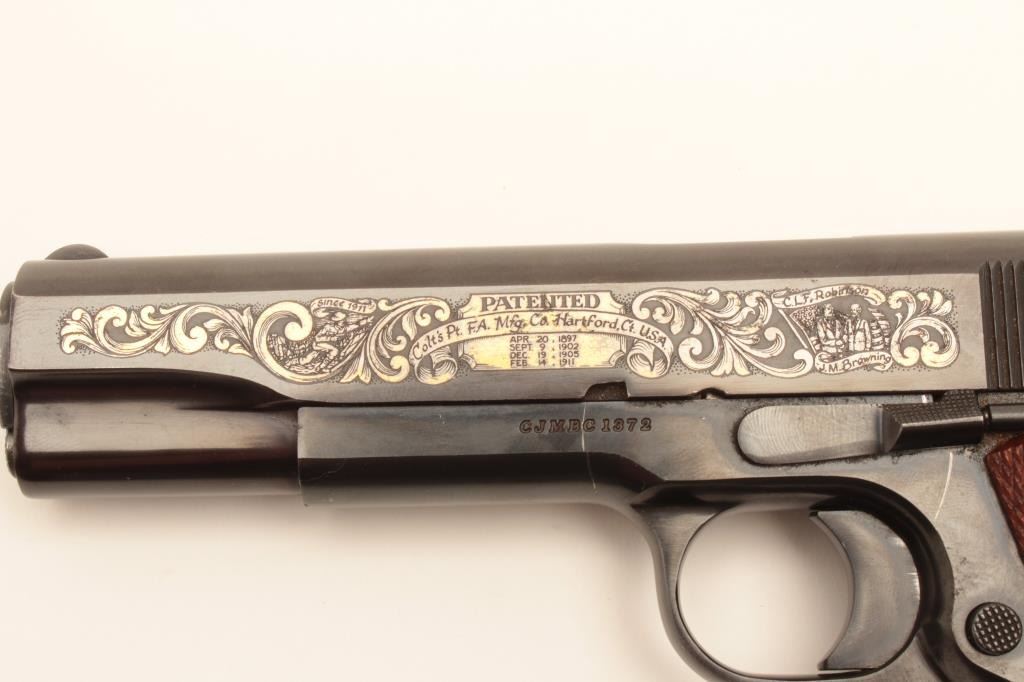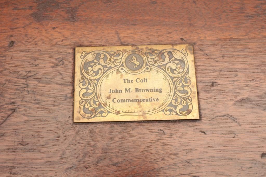 Colt “John Browning” commemorative 1911 .45 semi-auto pistol made 1981, S/N CJMBC1372. Near fine with a few scratches and minor use. The pistol is 96%-98% overall. The box shows storage and wear. These are becoming scare.(C&R/No PPT) Est.: $800-$1600