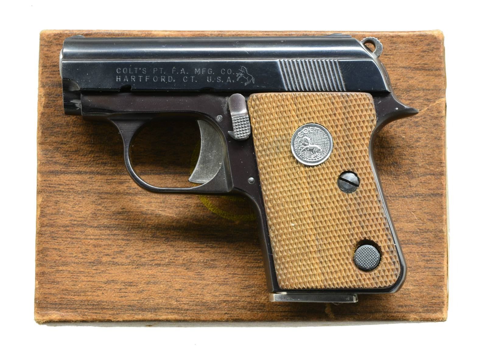 Cal. 25 ACP. S# OD58793. Bbl. 2 1/8". Blade front sight w/ square notch rear sight. Ring style hammer. Blue finish w/ polished hammer & trigger. 2 Piece checkered walnut grips w/ Rampant Colt medallions. 1972 Mfg. MAGS: 1 detachable 6 rds. UNATTACHED ACCESSORIES: 2 piece wood grain box w/ matching label. CONDITION: 99% original finish showing sm. marks on sides of trigger. Bore retains strong rifling. (20-3274/DS). MODERN. $400-600.