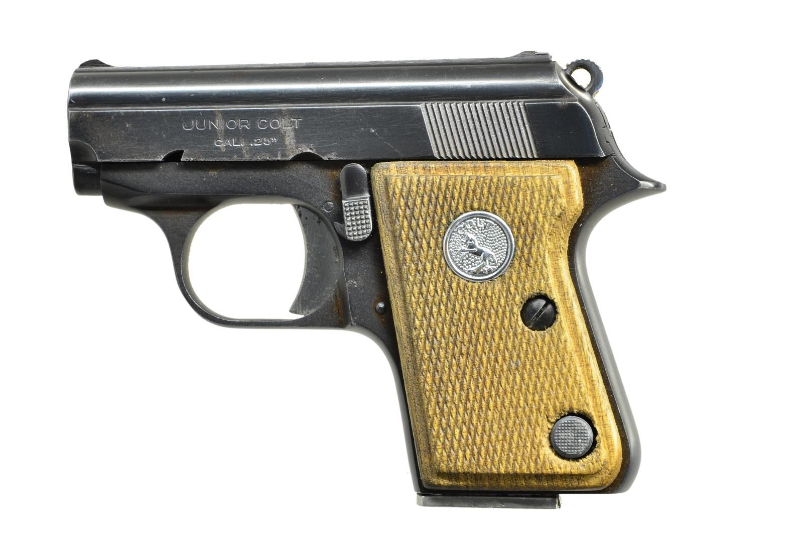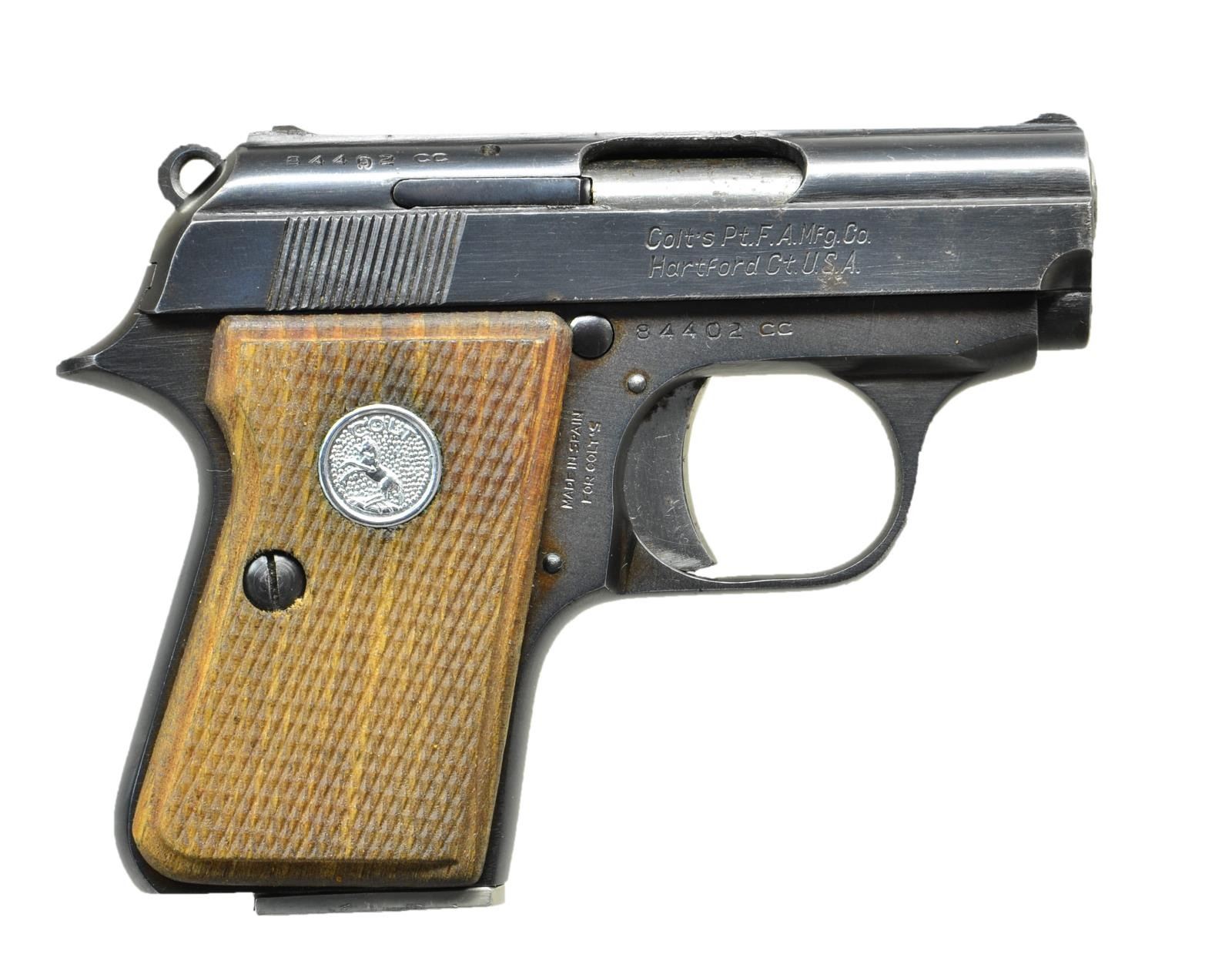 Cal. 25 ACP. S# 84402CC. Bbl. 2 1/8". Blade front sight. Square notch rear sight. Mfg. 1968. Matching numbered slide. Spanish made for Colt. Checkered grips w/ silver Colt medallions. MAGS: 1-6 rd. CONDITION: grips show light handling wear. Metal retains 90% original blue w/ some light pitting on left side of frame & high edge wear. Very good bore. (22-4262/MJC). CURIO. $300-400.