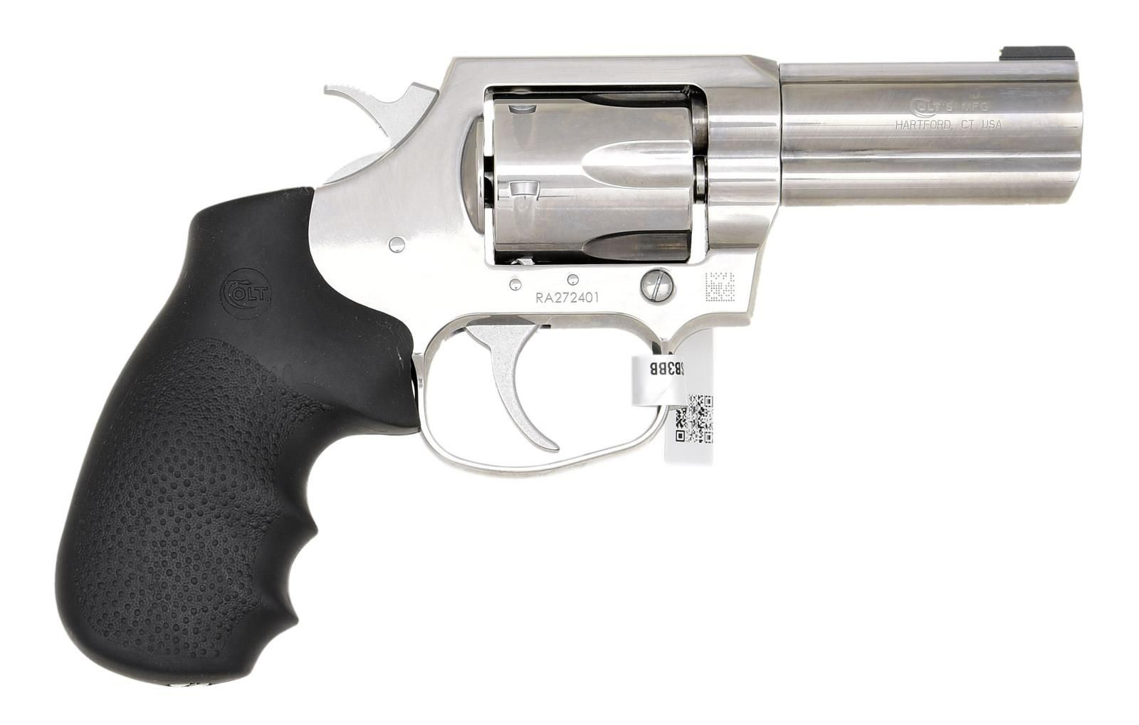 MATCHING FACTORY CASE. Cal. 357 Mag. S# RA272401. Bbl 3 1/8". King Cobra double action revolver manufactured by Colt. The left side of the barrel is stamped "KING (COBRA HEAD) COBRA/ 357 MAGNUM", with Colt's address on the right. Left side of frame is stamped with the Rampant Colt logo. Stainless steel finish, with a Colt textured black rubber grip. Brass beaded front sight with frame square notch rear sight. UNATTACHED ACCESSORIES: matching factory blue plastic hard case containing factory paperwork and lock. CONDITION: excellent, with metal components retaining what appears to be thin layer of factory grease on the exterior. Brilliant mirror bore, exhibiting well defined rifling throughout. Black rubber grip is very good overall. (236-2709/MLW). MODERN. $500-750.
