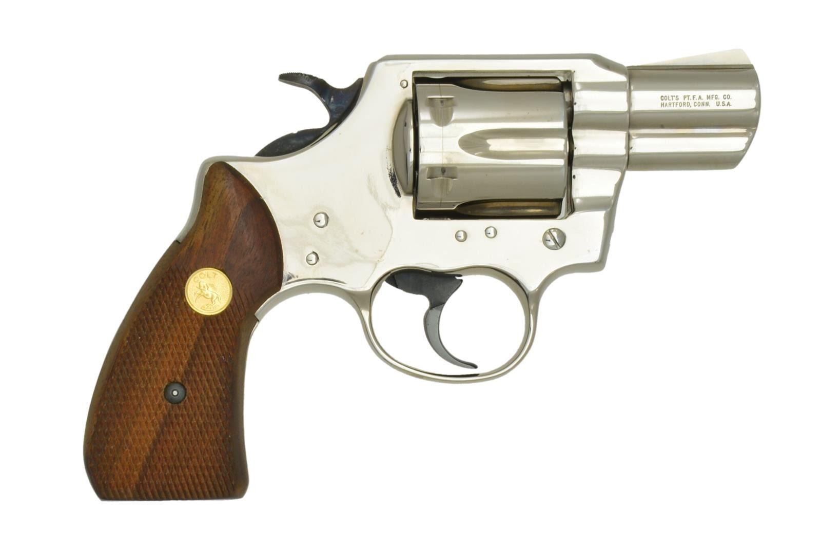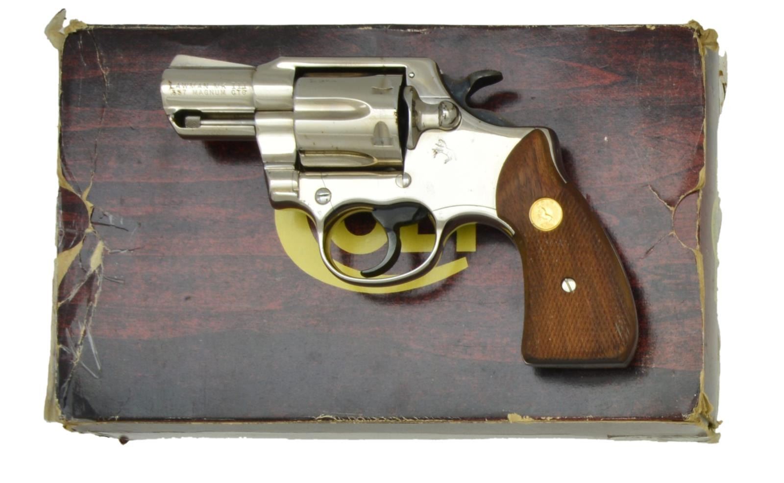 Cal. 357 Mag. S# 00615U. Bbl. 2" with shrouded ejector and ramp front sight. 6 Shot fluted cylinder. Nickel finish with case colored hammer and blue trigger. 2 Piece checkered walnut grips with gold Rampant Colt medallions. Mfg. 1969-1983. UNATTACHED ACCESSORIES: foam lined wood grain box with matching label. Box contains instruction manual and Colt Companion pamphlet. CONDITION: 98% nickel showing cylinder drag line and spots of corrosion. Very good grips. Bright near excellent bore. (22-4001/DS). MODERN. $1,000-1,500.