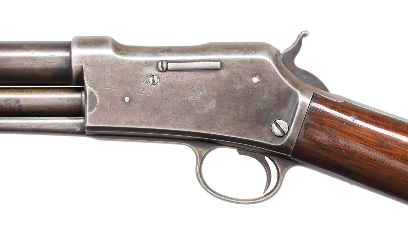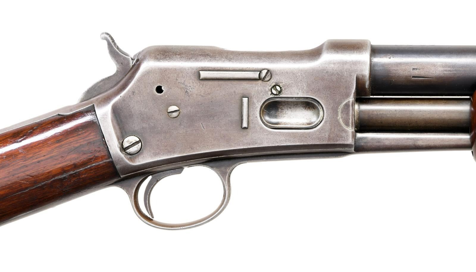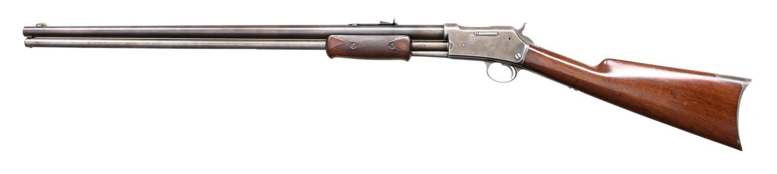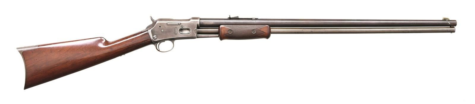 Cal. 32-20. S# 17508. Bbl. 26" round w/ rocky mountain front & sporting rear sight. Full length mag. Two piece checkered walnut slide handle. Straight grip stock w/ crescent steel buttplate. Mfg. 1886. CONDITION: bbl. retains 70% lightly faded blue. Action & mag. tube retain some blue in protected areas fading to gray. Wood has a gloss refinish showing scratches & marks. Stock is cracked on right side of wrist. Forearm has weakened checkering. Bore retains good rifling w/ some very light pitting. (01-25126/DS). ANTIQUE. $1,200-1,800.