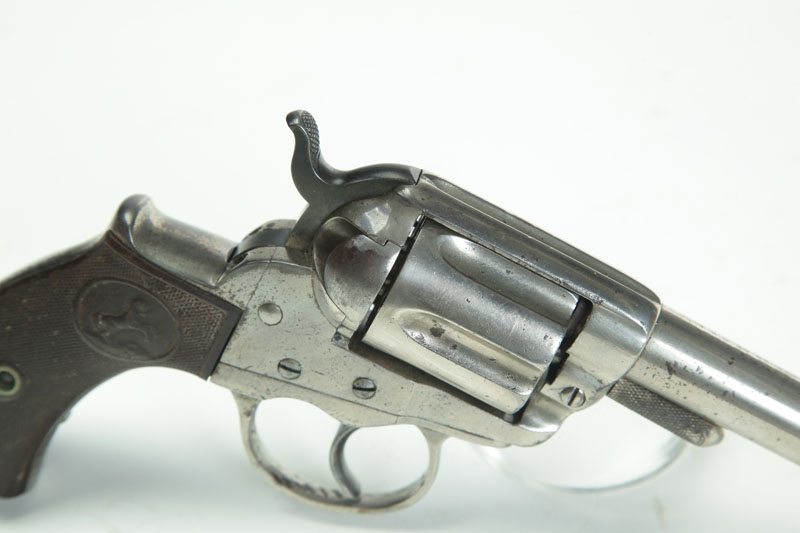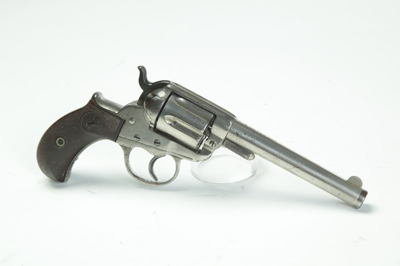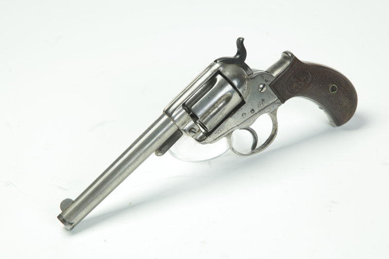 Model 1877, double-action, .38 caliber, 5" round barrel, no ejector, and checkered rubber grips. S/n 6896 (matching).