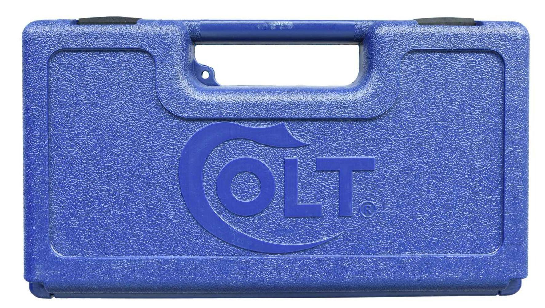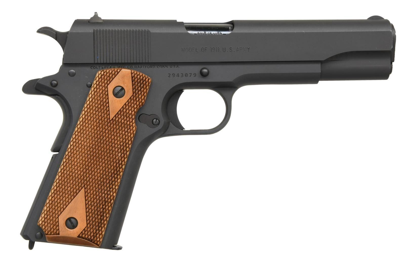 PISTOL. Cal. 45 ACP. S# 2943079. Bbl. 5" with "H" and "P" over chamber plus "P" and "M" on right leg; "- COLT 45 AUTO -" on right side showing at bottom of port area. Mfg. Jan. 23, 2020 with matte blue finish and model number "01911M". Limited Edition from Colt to exemplify WW-I example. Frame is 70 Series without reliefs at trigger which is short like WW-II rather than the original long version. Slide stop and thumb safety are checkered with undercuts. Grip safety is short at top, but not as short as used on 1911's but not extended like on 1911-A1's. Newly manufactured double diamond checkered grips of light colored hard wood. Void of inspection marks, but provisional "H" by disconnector and on rear of slide. Model marking on slide is directly under ejection port rather than normal more forward position. Colt markings on left side of slide are missing rampant Colt between the 2 sections. Proper style wide spur hammer and "U" notched rear sight. Spring guide has blunt legs with modern attached guide rod having Nation Match style bullet shape at front. Flat mainspring housing with lanyard loop. Overall, a nice recreation with attention to details allowing vintage appearance by Colt at a modest cost. MAGS: 1 polished blue 7 rd. marked "45 ACP." near bottom of left side. UNATTACHED ACCESSORIES: w/box. CONDITION: all aspects near excellent including bore and grips; appears new and unfired. PROVENANCE: The Collection of Gun Sport Ltd owned by Jon R. Thomas. (23-3878/NW). MODERN. $750-1,000.