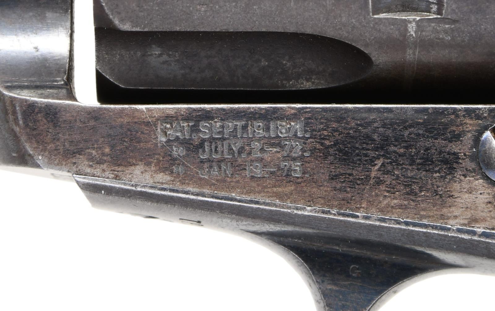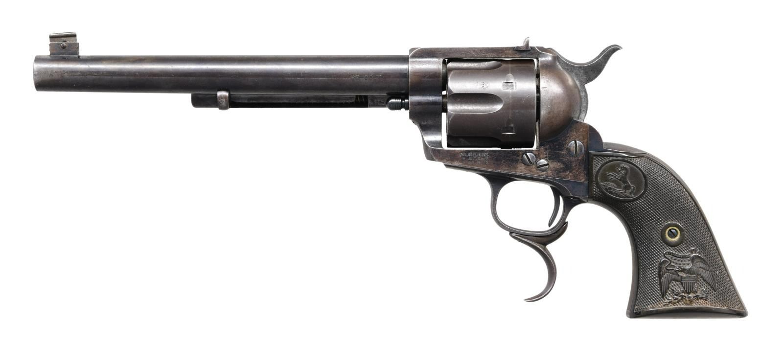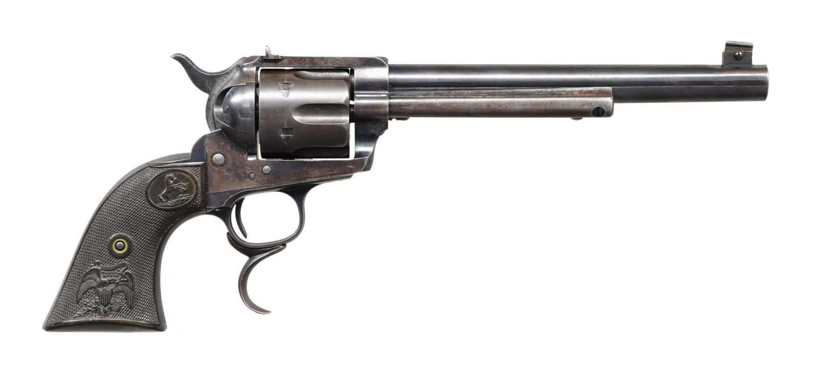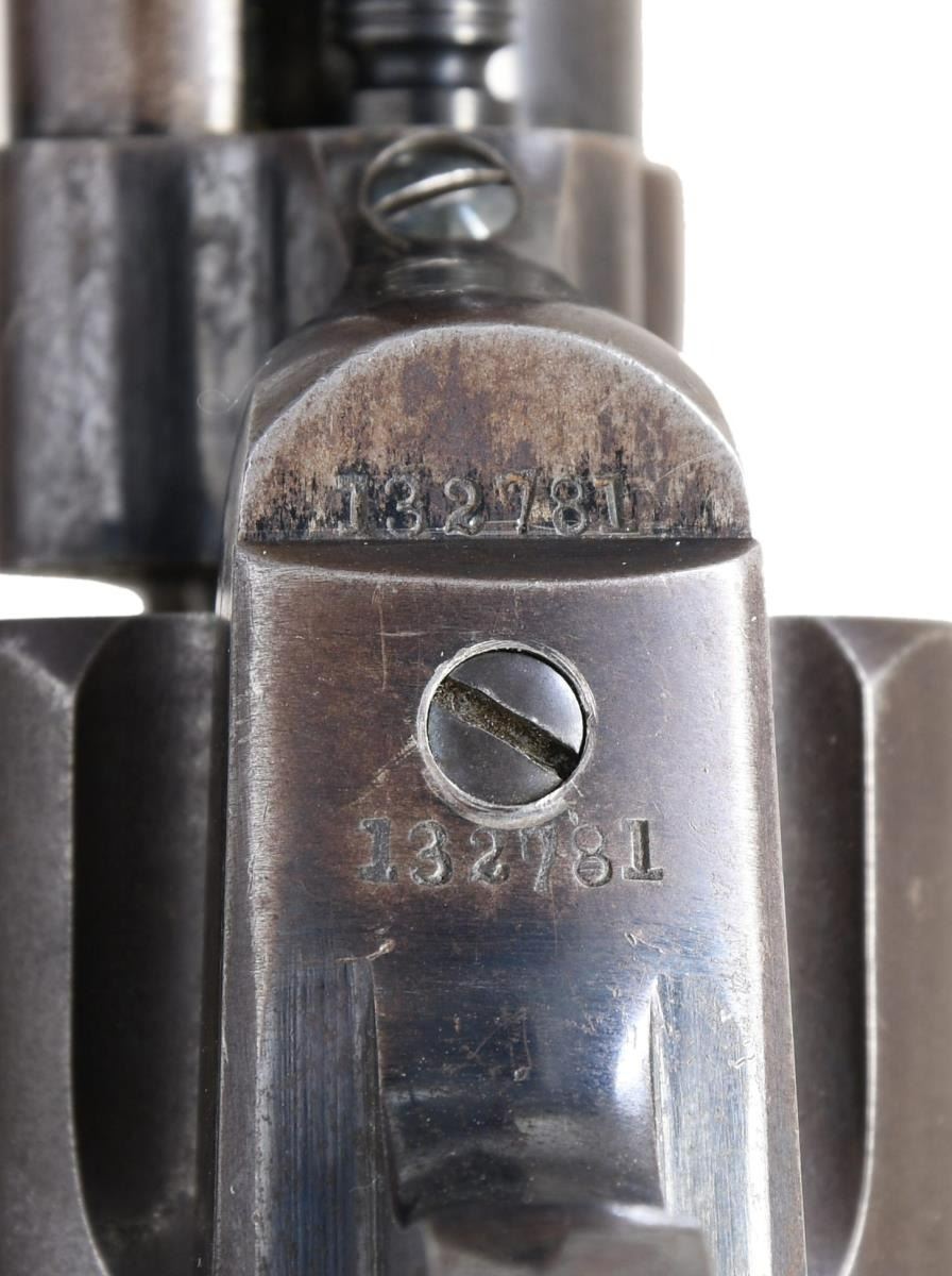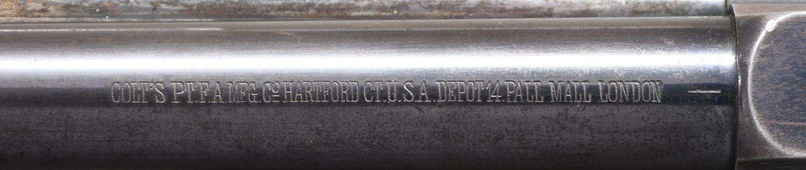 Cal. 38 Colt. S# 132781. Bbl. 7 1/2" marked "COLT'S PT. F. A. MFG. Co. HARTFORD CT. U.S.A. DEPOT 14. PALL MALL LONDON". Pinned beaded blade front sight w/ U notch rear sight. Flat top target style frame. Six shot fluted cyl. Blue finish. Checkered trigger. Trigger guard has an added metal finger rest attached by a single screw. 2 piece hard rubber eagle grips. 925 flat top target models were mfg. 1888-96. This revolver was mfg. 1890. CONDITION: 70% blue showing flaking on frame. Cyl. is fading to brown & shows a drag line. Grips show light wear. Tight action, hammer retains all 4 clicks. Bore is generally bright w/ strong rifling showing small spots of light pitting. (01-24809/DS). ANTIQUE. $10,000-15,000.