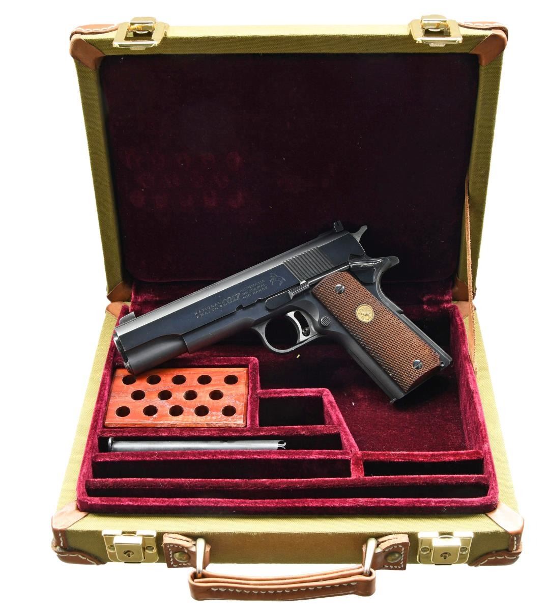 PISTOL. Cal. 38 Special Mid-Range Wadcutter. S# 685-MR (1961). National Match 5" barrel. Patridge front sight & adj. rear sight. Grooved frontstrap & flat mainspring housing. Checkered walnut grips w/ gold Colt grips. Skeletonized trigger with over travel adjustment. MAGS: 2 - 9 rd. UNATTACHED ACCESSORIES: Green canvas carrying case with red velour fitted interior with compartments for keys, 14 rounds cartridge block & magazines. CONDITION: near excellent blued finish & grip finish. Near excellent bore. (24-1692/MD). CURIO. $1,750-2,500.