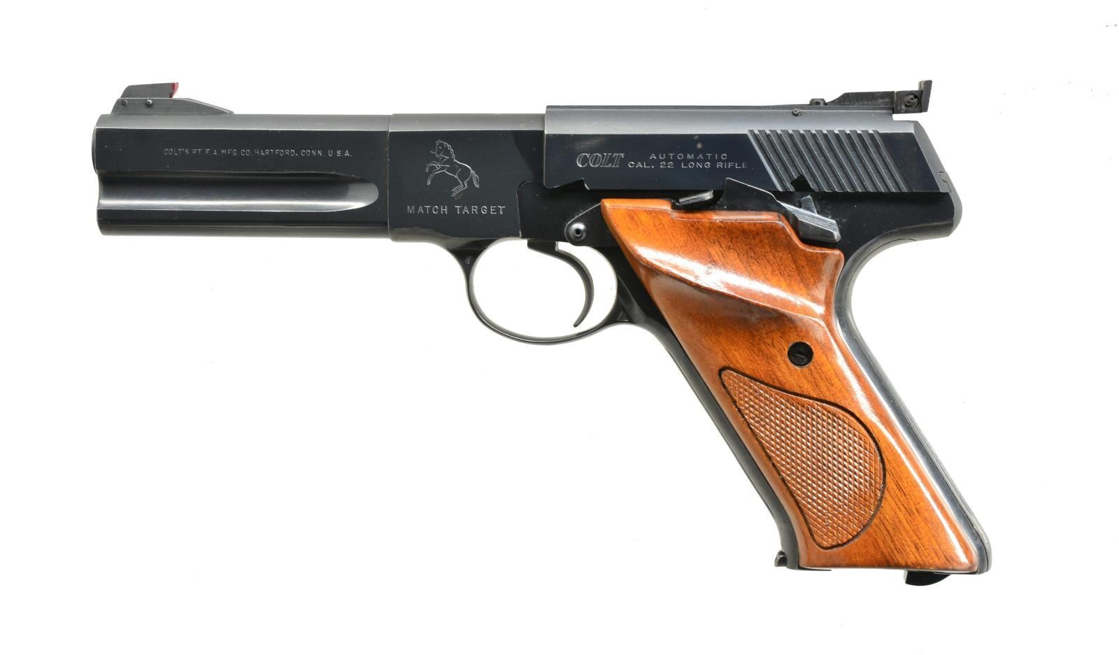 Cal. 22 LR. S# 042089S. Bbl. 4 1/2" flat sided w/ full lug. Ramp mounted Patridge front sight w/ Elliason square notch adj. target rear sight. Blue finish. 2 Piece checkered walnut thumb rest grips. Mag. release at butt. 1973 Mfg. MAGS: 1 detachable 10 rd. CONDITION: over 98% original blue. Grips show light handling marks. Bright near excellent bore. (20-3304/DS). MODERN. $750-1,000.