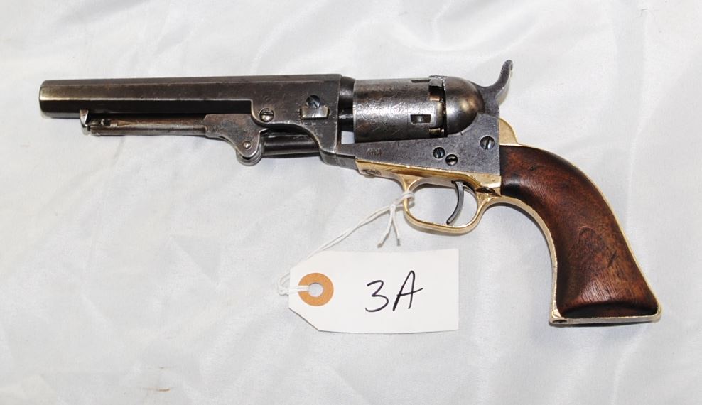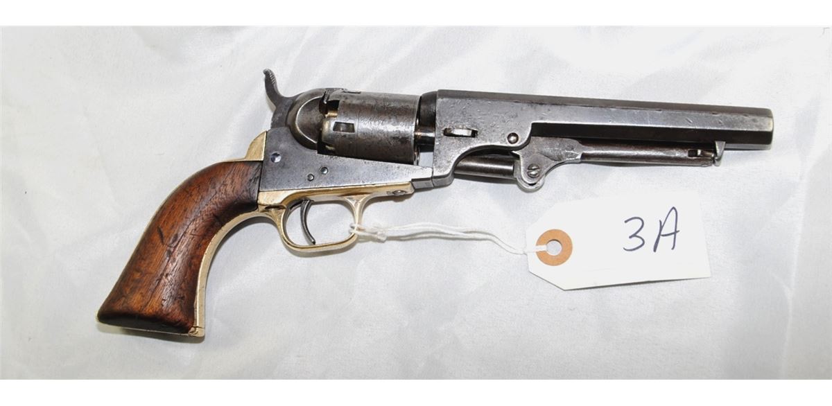COLT MODEL 1849 .31 CALIBER POCKET REVOLVER - SERIAL # 93550 - BARREL LENGTH 5 1/2" - 5 SHOT CYLINDER - SOME ENGRAVING, BARREL MARKING NOT VISIBLE - SMALL CHIP LEFT GRIP - NICE CONDITION