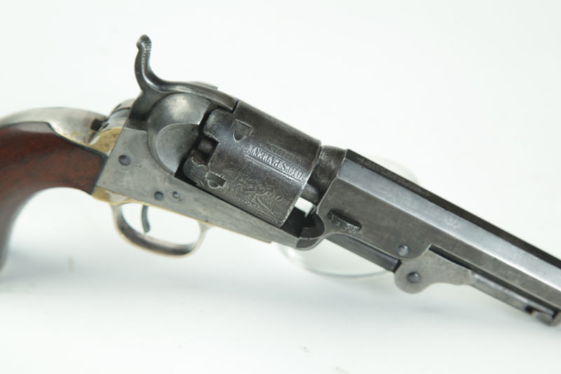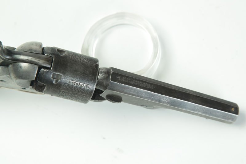 .31 caliber, 4" octagonal barrel, 5-shot cylinder with engraved scene, small trigger guard, silvered straps, two-line New York address, second-type loading slot, and walnut grips. S/n 134810 (matching).
