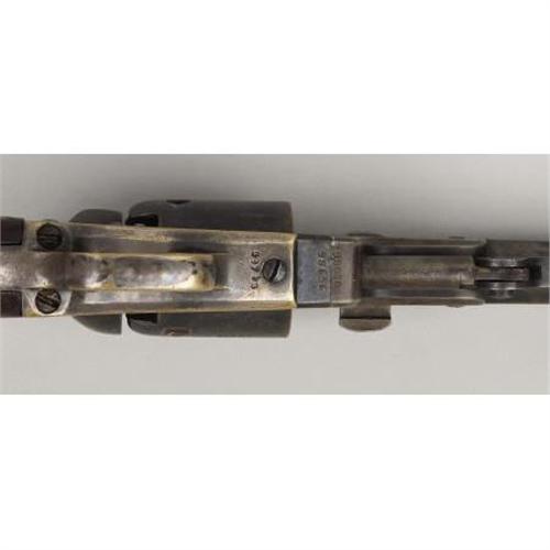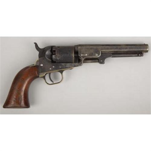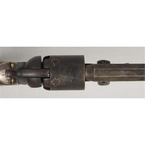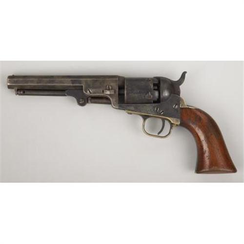 <B>COLT MODEL 1849 POCKET REVOLVER</B></I> - Frame, lever, barrel and wedge serial number 98656. cylinder trigger guard and backstrap serial number 59745. 5" barrel in. .31 calibre with five shot cylinder. Wood grips and mechanically functioning. <BR><BR><B>Condition:</B></I> Cylinder scene about ninety percent visible. Seventy percent silver on backstrap and trigger guard. All factory markings are sharp and clear. Sixty percent original varnish remains on grips. Cold blue added to cylinder. Metal surfaces are relatively pit free.<BR><BR><b>Shipping:</b> Bats, Clubs, Sticks, Swords, Rif (<a target="_blank" href="http://www.heritageauctions.com/common/shipping.php">view shipping information</a>)