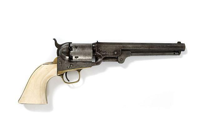 COLT MODEL 1851 NAVY REVOLVER CAL. 36 Canon pans (7 1/2'') marked ADDRESS COL. SAML COLT NEW YORK U.S. AMERICA. Open frame. Six rooms barrel engraved naval battle??? Single action. Saddle and bridle butts brass. Ivory grips. No. 144180.